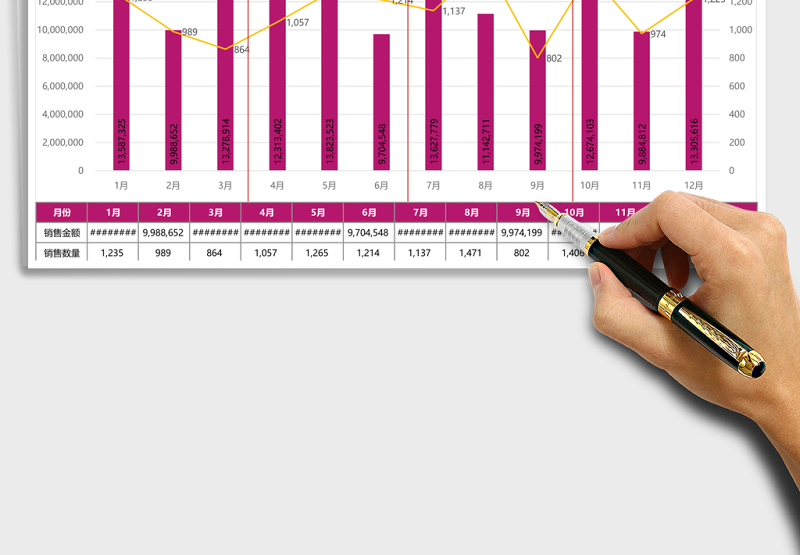 全年銷(xiāo)售數(shù)量金額對(duì)比自動(dòng)折線柱狀圖EXCEL表格模板