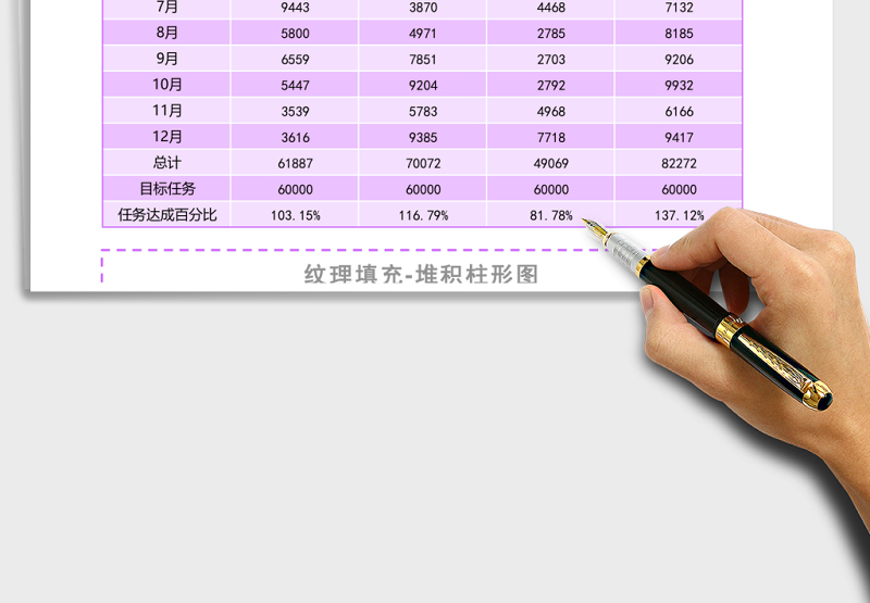 紫色員工業(yè)績統(tǒng)計堆積柱形圖Excel模板