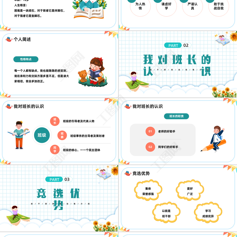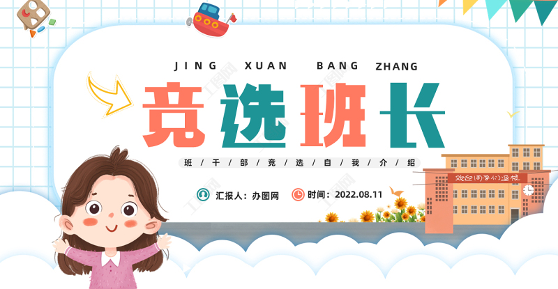 工圖網(wǎng)提供2022競選班長PPT藍(lán)色卡通風(fēng)中小學(xué)生競選班長班干部競選自我介紹主題班會(huì)課件模板供會(huì)員免費(fèi)下載。更多精彩黨課PPT素材,盡在工圖網(wǎng)。