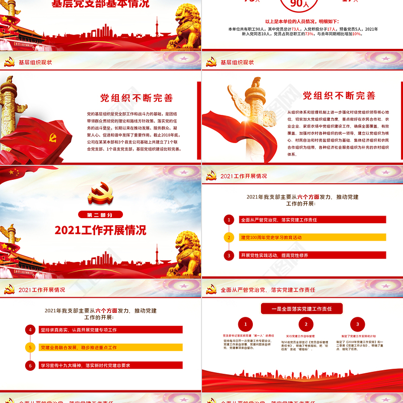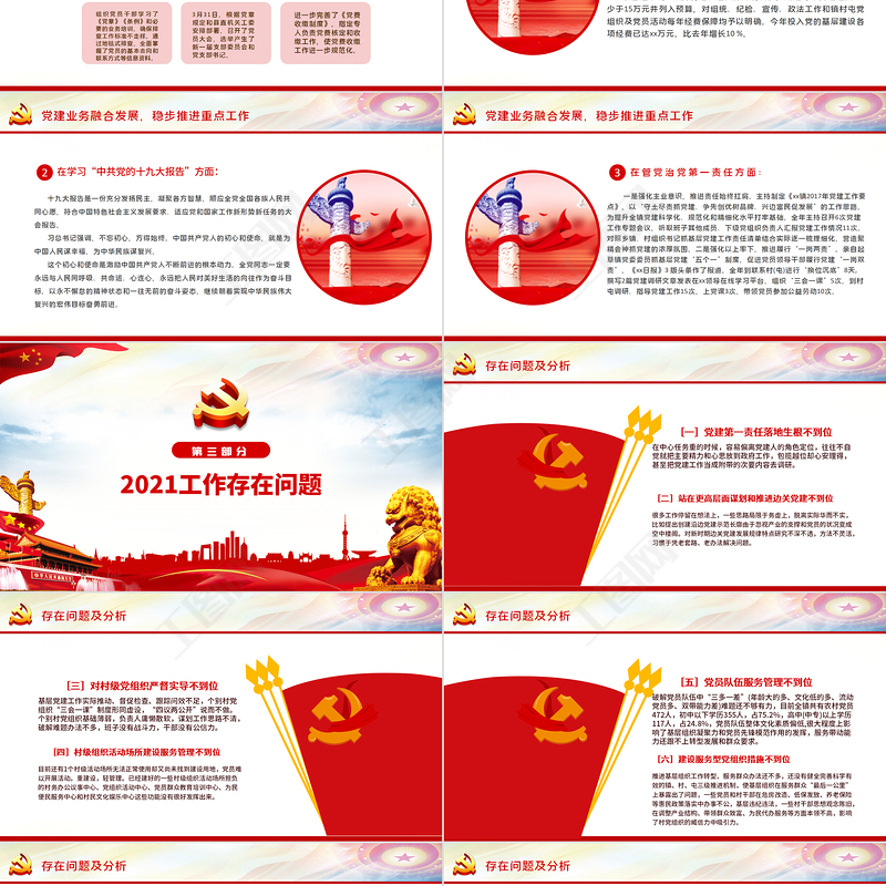 2021工作開展情況2021年我支部主要從六個方面發(fā)力,推動黨建工作的開展:堅(jiān)持求真務(wù)實(shí),認(rèn)真開展黨建專項(xiàng)工作黨建業(yè)務(wù)融合發(fā)展,穩(wěn)步推進(jìn)重點(diǎn)工作學(xué)習(xí)宣傳十九大精神,落實(shí)新時(shí)代黨建總要求456