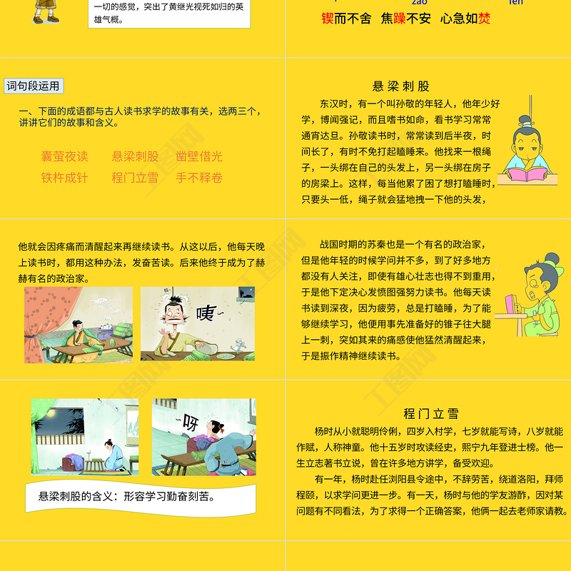 詞句段運(yùn)用一、下面的成語都與古人讀書求學(xué)的故事有關(guān),選兩三個(gè),講講它們的故事和含義。囊螢夜讀 懸梁刺股 鑿壁借光 鐵杵成針 程門立雪 手不釋卷