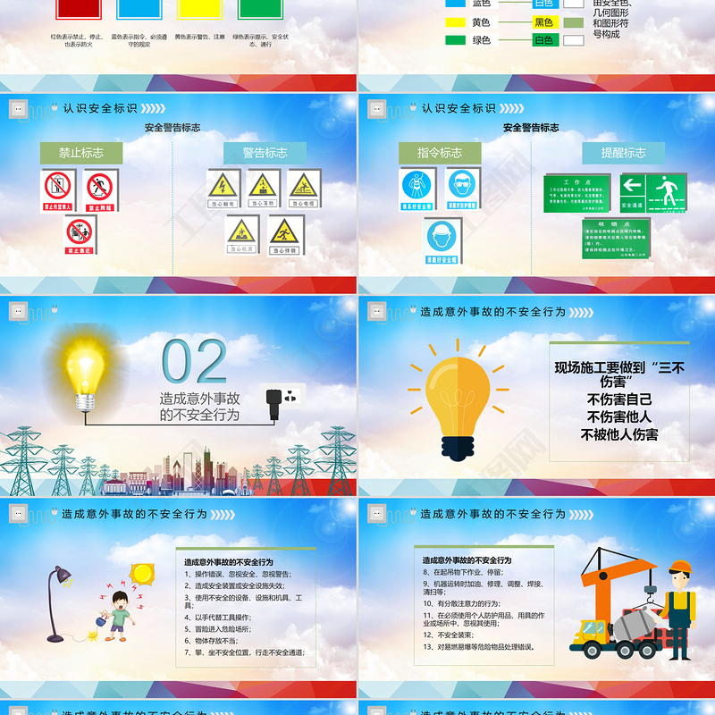 01認(rèn)識(shí)安全標(biāo)識(shí)0203造成意外事故的不安全行為進(jìn)入施工現(xiàn)場一般規(guī)定目錄CONTENTS04預(yù)防工作場所滑倒和絆倒0506高空工作安全要點(diǎn)消防安全要點(diǎn)