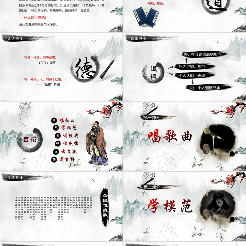 道德講堂校園文明教育主題班會動態(tài)PPT模板,中國風水墨國學講堂,水墨風道德講堂,政府文化教育,法律講堂 Array