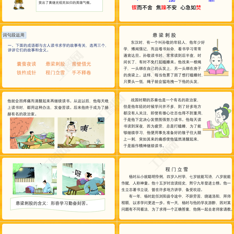 詞句段運(yùn)用一、下面的成語都與古人讀書求學(xué)的故事有關(guān),選兩三個(gè),講講它們的故事和含義。囊螢夜讀 懸梁刺股 鑿壁借光 鐵杵成針 程門立雪 手不釋卷