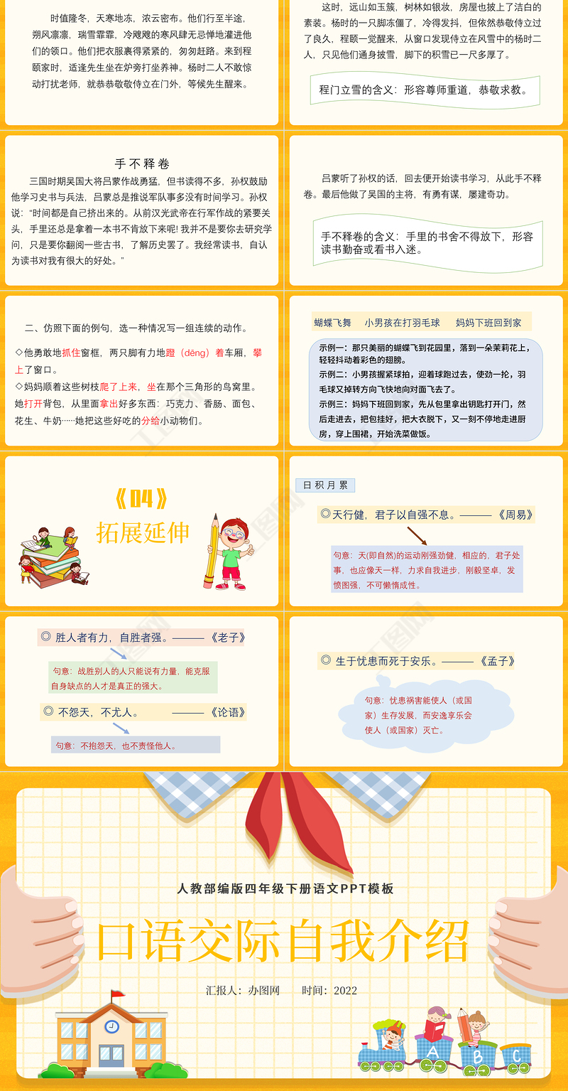 人教部編版四年級(jí)下冊(cè)語文PPT模板口語交際自我介紹匯報(bào)人:辦圖網(wǎng) 時(shí)間:2022