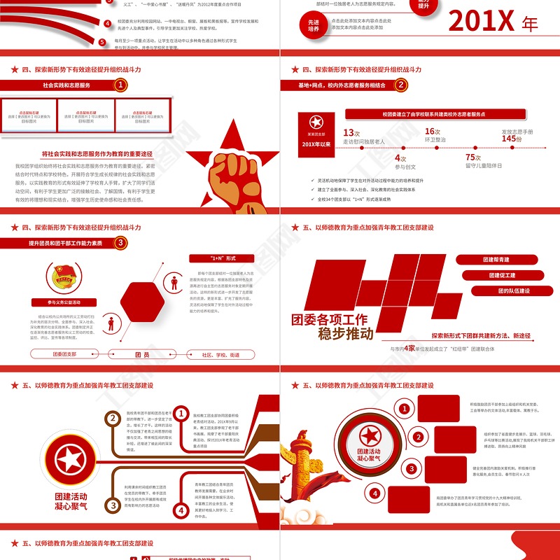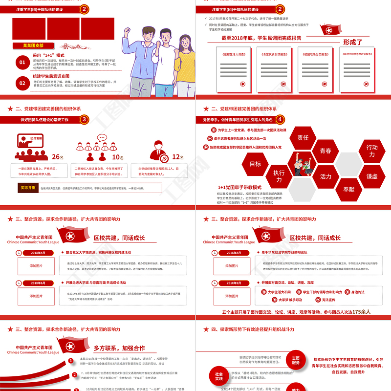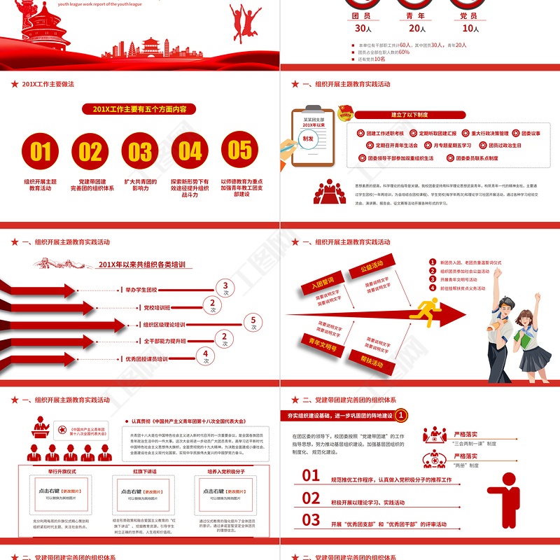 <p>各基層團支部開展工作/制定計劃/總結匯報/主題教育/團日活動take dreams as horses and live up to the work summary of the communist youth league work report of the youth league宣講人:某某某 時間:20XX.XX2021團委團支部工作計劃</p><br><p>前言在團區(qū)委的正確領導、教育局團工委的指導、校黨總支的帶領下,在全校團員青年的積極參與中,XX共青團高舉習近平總書記新時代特色社會主義思想的偉大旗幟,以黨的十九大精神為指導,緊緊圍繞學校中心工作,堅持與學校發(fā)展戰(zhàn)略相適應,與廣大青年發(fā)展需求相結合,堅持黨建帶團建,加強團員青年的政治思想教育,開展了一系列有影響、有實效的活動,并逐步形成了團工作的自身特色,團的各項任務都得到了全面落實,在團的思想建設、組織建設、校園文化建設、社會實踐等領域開展工作,實現(xiàn)了我校團工作的新發(fā)展。</p><br><p>目錄</p><br><p>2020年工作開展情況 第一部分take dreams as horses and live up to the work summary of the communist youth league work report of the youth league</p><br><p>30人中國共產(chǎn)主義青年團Chinese Communist Youth League在這里輸入你的團委或團支部名稱團 員青 年黨 員 本單位有干部職工共計60人,其中團員30人,青年20人團員占全部在職人數(shù)的60%還有黨員10名20人10人本單位團支部基本情況</p><br><p>201X工作主要做法</p><br><p>某某團支部制發(fā)201X年以來思想素質的提高,科學理論的指導是關鍵。我校團委堅持用科學理論思想武裝青年,構筑青年一代的精神支柱,主要通過學生團校(一年兩培訓,為自培結合團校課程)、學生黨校(每學年兩次)和理論學習社團開展活動,通過各種學習經(jīng)驗交流會、演講賽、報告會、征文賽等活動開展各種形式的學習。一、組織開展主題教育實踐活動</p><br><p>3次2次5次2次4次201X年以來共組織各類培訓一、組織開展主題教育實踐活動</p><br><p>簡要說明文字簡要說明文字簡要說明文字簡要說明文字簡要說明文字簡要說明文字簡要說明文字簡要說明文字公益活動入團誓詞青年文明號幫扶活動新團員入團、老團員重溫誓詞儀式組織團員參加社會公益活動開展青年文明號活動前往掛幫扶貧點義務活動一、組織開展主題教育實踐活動</p><br><p>《中國共產(chǎn)主義青年團第十八次全國代表大會》認真貫徹《中國共產(chǎn)主義青年團第十八次全國代表大會》共青團十八大是在中國特色社會主義進入新時代召開的一次重要會議,是全國各族團員青年政治生活中的一件大事。這次大會將進一步動員廣大團員青年,高舉習近平新時代中國特色社會主義思想偉大旗幟,全面貫徹黨的十九大精神,為決勝全面建成小康社會、全面建設社會主義現(xiàn)代化國家、實現(xiàn)中華民族偉大復興的中國夢努力奮斗。舉行升旗儀式充分利用每周的升旗儀式精心策劃和組織緊扣時代主題、關注社會熱點、紅旗下講話結合形勢政策和融合愛國主義教育的“紅旗下講話”, 挖掘教育資源,引導學生樹立正確的世界觀、人生觀和價值觀。培養(yǎng)入黨積極分子通過儀式教育的強化提升了全體團員的意識,通過承諾宣誓堅定全體團員的理想信念。一、組織開展主題教育實踐活動</p><br><p>嚴格落實“三會兩制一課”制度嚴格落實“兩冊”制度在團區(qū)委的領導下,校團委按照“黨建帶團建”的工作指導思想,努力推動基層組織建設。加強基層團組織的制度化、 規(guī)范化建設。01規(guī)范推優(yōu)工作程序,認真做入黨積極分子的推薦工作02積極開展以理論學習、實踐活動03開展“優(yōu)秀團支部”和“優(yōu)秀團干部”的評審活動二、黨建帶團建完善團的組織體系</p><br><p>某某團委計劃某某團支部即每月初一次培訓、每月末一次計劃或總結會,引導學生(團)干部從青年學生成長成才的規(guī)律出發(fā),創(chuàng)造性的開展工作,培養(yǎng)了一批優(yōu)秀的學生團干部。采用“1+1”模式他們的主要任務是了解、收集、調(diào)查學生對于學校工作的意見,并將意見匯總向學校反饋,經(jīng)過溝通后最終形成可行性方案組建學生民意調(diào)查團二、黨建帶團建完善團的組織體系</p><br><p>截至2018年底,學生民調(diào)團完成報告形成了《住宿生活大調(diào)查》《食堂伙食反饋報告》《校園垃圾分類報告》《新時代團員思想政治報告》2017年5月我校召開第二十七次學代會,進行了新一屆換屆選舉同時在民調(diào)團的基礎上,團委、學生會增設權益部完善組織機構以全方位服務于學生和學校的發(fā)展二、黨建帶團建完善團的組織體系</p><br><p>一是在團員發(fā)展上,嚴格把關,今年共吸收26名同學入團。26名二是推優(yōu)入黨認真負責,今年共推薦了10名同學參加區(qū)入黨積極分子培訓班,10名向黨組織推薦優(yōu)秀團員12人,目前列為發(fā)展對象3人。12名在做好優(yōu)秀團支部、優(yōu)秀團干部評選工作的同時,不放松對違紀違規(guī)同學的懲處,一律記入檔案。二、黨建帶團建完善團的組織體系</p><br><p>責任青春活力行動力奉獻謙虛執(zhí)行力目標1+1黨團牽手帶教模式經(jīng)過我校黨總支通過,校團委在征求各團支部內(nèi)團員學生的意愿的基礎上,初步形成了一位黨(團)員教師結對一個團支部的“1+1”黨團牽手帶教模式二、黨建帶團建完善團的組織體系</p><br><p>中國共產(chǎn)主義青年團Chinese Communist Youth League