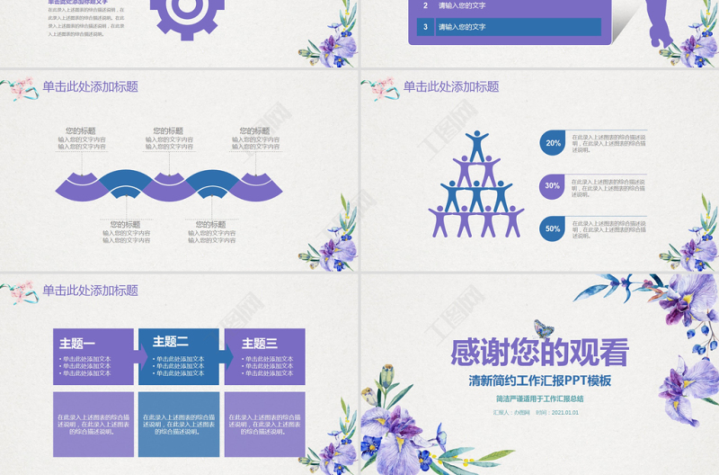 紫色簡(jiǎn)約風(fēng)清新簡(jiǎn)約工作匯報(bào)PPT模板簡(jiǎn)潔嚴(yán)謹(jǐn)適用于工作匯報(bào)總結(jié)匯報(bào)人:辦圖網(wǎng) 時(shí)間:2021.01.01