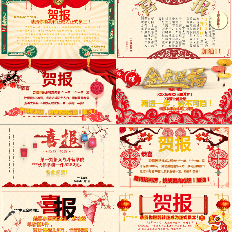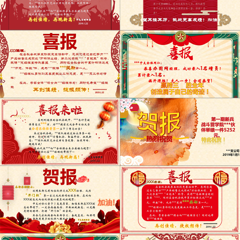 <p>2 0 1 9熱 烈 祝 賀在此填入您的信息在此填入您的信息在此填入您的信息</p><br><p> 辦圖網(wǎng)伙伴成功預(yù)收***一單,***一單,累計保費(fèi)8000元,成功達(dá)成陽光人力,順利獲得春節(jié)走訪大禮包30套以及職業(yè)裝一套,恭喜!恭喜!望再接再厲,挑戰(zhàn)更高成績!加油!恭喜</p><br><p>XXXXXXXX: 在剛剛結(jié)束的金秋會戰(zhàn)中,***總計貢獻(xiàn)保費(fèi)高達(dá)***萬,為***提前完成全年目標(biāo)及榮獲全省承保保費(fèi)第一立下了悍馬功勞! 本次金秋會戰(zhàn),**團(tuán)隊繼續(xù)發(fā)揚(yáng)永爭第一的精神,充分利用**停售機(jī)會,勤奮拜訪,挑戰(zhàn)新高。**團(tuán)隊依然充分發(fā)揮自身優(yōu)勢,拓展市場,超越自我! 在此代表***向**全體將士表示感謝與祝賀!同時希望你們在***經(jīng)理的帶領(lǐng)下~中支總經(jīng)理室2019.1.22再創(chuàng)佳績,再現(xiàn)新高!</p><br><p>賀報XXXXXXXX: 在剛剛結(jié)束的金秋會戰(zhàn)中,***總計貢獻(xiàn)保費(fèi)高達(dá)***萬,為***提前完成全年目標(biāo)及榮獲全省承保保費(fèi)第一立下了悍馬功勞! 本次金秋會戰(zhàn),**團(tuán)隊繼續(xù)發(fā)揚(yáng)永爭第一的精神,充分利用**停售機(jī)會,勤奮拜訪,挑戰(zhàn)新高。**團(tuán)隊依然充分發(fā)揮自身優(yōu)勢,拓展市場,超越自我! 在此代表***向**全體將士表示感謝與祝賀!同時希望你們在***經(jīng)理的帶領(lǐng)下~中支總經(jīng)理室2019.1.22再創(chuàng)佳績,再現(xiàn)新高!</p><br><p> 辦圖網(wǎng)伙伴成功預(yù)收***一單,***一單,累計保費(fèi)8000元,成功達(dá)成陽光人力,順利獲得春節(jié)走訪大禮包30套以及職業(yè)裝一套,恭喜!恭喜!望再接再厲,挑戰(zhàn)更高成績!加油!熱 烈 祝 賀</p><br><p>喜報XXX經(jīng)理: 在金秋會戰(zhàn)第五階段競賽活動中,悉聞您通過自己努力***產(chǎn)品銷售達(dá)成預(yù)收*萬標(biāo)保業(yè)績,第二次榮獲***“日冠王”稱號,獲得**總經(jīng)理室特別嘉獎“***,同時在金秋會戰(zhàn)中累計標(biāo)保達(dá)成***萬元、件數(shù)*件,成為***獲得***獎勵第一人。 ***經(jīng)理以身作則及高度敬業(yè)工作態(tài)度,是****員工學(xué)習(xí)榜樣! 在此,號召全體**將士向***經(jīng)理學(xué)習(xí)!同時也希望***經(jīng)理能***********2019.1.22再創(chuàng)佳績,捷報頻傳!</p><br><p>***中支全體同仁:恭喜辦圖網(wǎng)經(jīng)理,成功錄入1名增員!累計錄入1名。旗開得勝!先人一步!全司恭賀!贏跨三 勝全年創(chuàng)造屬于自己的奇跡!</p><br><p>XXXXXXXX: 在剛剛結(jié)束的金秋會戰(zhàn)中,***總計貢獻(xiàn)保費(fèi)高達(dá)***萬,為***提前完成全年目標(biāo)及榮獲全省承保保費(fèi)第一立下了悍馬功勞! 本次金秋會戰(zhàn),**團(tuán)隊繼續(xù)發(fā)揚(yáng)永爭第一的精神,充分利用**停售機(jī)會,勤奮拜訪,挑戰(zhàn)新高。**團(tuán)隊依然充分發(fā)揮自身優(yōu)勢,拓展市場,超越自我! 在此代表***向**全體將士表示感謝與祝賀!同時希望你們在***經(jīng)理的帶領(lǐng)下~中支總經(jīng)理室2019.1.22再創(chuàng)佳績,再現(xiàn)新高!</p><br><p>賀報——^熱烈祝賀^—— 第一期新兵戰(zhàn)斗營學(xué)院***伙伴舉績一件5252元。特此祝賀!***支公司2019年1月1日</p><br><p>賀報本部全體將士: 欣聞本部已有兩位伙伴達(dá)成XXX標(biāo)準(zhǔn),成為“開門紅”第一家達(dá)成此獎項(xiàng)的服務(wù)部,在此向XXX副總及兩位伙伴致以最真誠的祝賀。 中支對你們寄予了高度厚望,相信本部在XXX副總的帶領(lǐng)下,一定會再接再厲,不斷挑戰(zhàn)新高,以龍騰虎嘯的精神,打好“開門紅”收官戰(zhàn)。 其余幾家機(jī)構(gòu)要向本部學(xué)習(xí),奮起直追,向獎項(xiàng)沖刺,爭取有更多的伙伴入圍此方案!加油!!中支總經(jīng)理室2019.1.22</p><br><p>XXX經(jīng)理: 在金秋會戰(zhàn)第五階段競賽活動中,悉聞您通過自己努力***產(chǎn)品銷售達(dá)成預(yù)收*萬標(biāo)保業(yè)績,第二次榮獲***“日冠王”稱號,獲得**總經(jīng)理室特別嘉獎“***,同時在金秋會戰(zhàn)中累計標(biāo)保達(dá)成***萬元、件數(shù)*件,成為***獲得***獎勵第一人。 ***經(jīng)理以身作則及高度敬業(yè)工作態(tài)度,是****員工學(xué)習(xí)榜樣! 在此,號召全體**將士向***經(jīng)理學(xué)習(xí)!同時也希望***經(jīng)理能***********2019.1.22再創(chuàng)佳績,捷報頻傳!</p><br><p>武陟機(jī)構(gòu)****伙伴: 7月22日入司,通過您的努力,順利簽單10000元,一舉達(dá)成《基本法》轉(zhuǎn)正要求,自8月1日起正式成為理財顧問,可喜可賀! 通過轉(zhuǎn)正您將獲得更多的資源支持,更高的基本法利益和更完善的福利保障,希望您每月進(jìn)入鉆星行列,獲得最高底薪,創(chuàng)造更高的收入,取得更多的榮譽(yù)!其他新人伙伴也要向宋四海學(xué)習(xí),奮起直追!在***的大舞臺實(shí)現(xiàn)您的人生價值,創(chuàng)造更多的輝煌!中支營銷部室2019.1.22恭賀你順利轉(zhuǎn)正成為正式員工!賀報</p><br><p>本部全體將士: 欣聞本部已有兩位伙伴達(dá)成XXX標(biāo)準(zhǔn),成為“開門紅”第一家達(dá)成此獎項(xiàng)的服務(wù)部,在此向XXX副總及兩位伙伴致以最真誠的祝賀。 中支對你們寄予了高度厚望,相信本部在XXX副總的帶領(lǐng)下,一定會再接再厲,不斷挑戰(zhàn)新高,以龍騰虎嘯的精神,打好“開門紅”收官戰(zhàn)。 其余幾家機(jī)構(gòu)