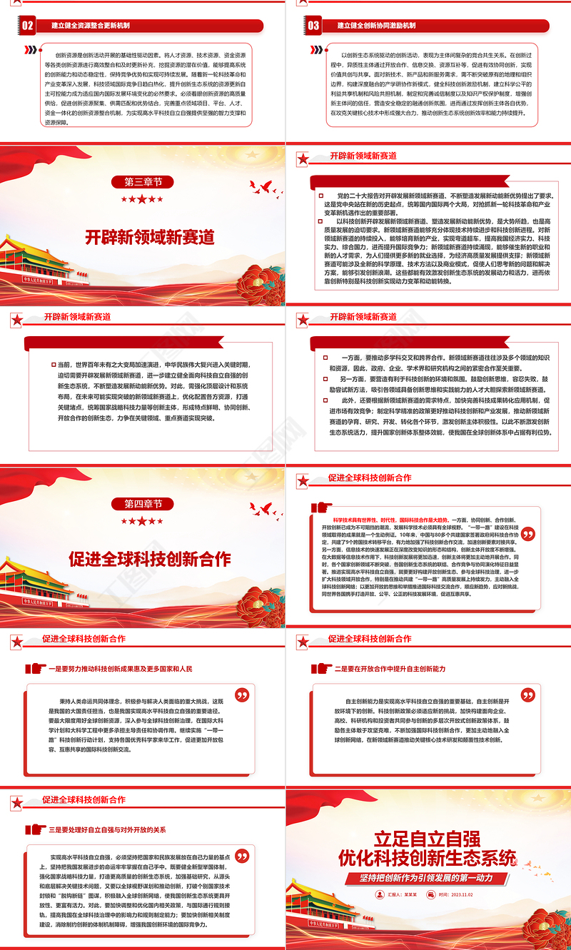 2023立足自立自強(qiáng)優(yōu)化科技創(chuàng)新生態(tài)系統(tǒng)ppt紅色精美立足自立自強(qiáng)優(yōu)化科技創(chuàng)新生態(tài)系統(tǒng)專題黨課教育課件 Array