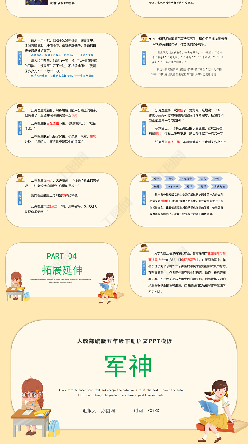Click here to enter your text and change the color or size of the text. Insert the data text icon, change the picture, and have a good time.contents人教部編版五年級下冊語文PPT模板軍神匯報人:辦圖網(wǎng) 時間:XXXXX