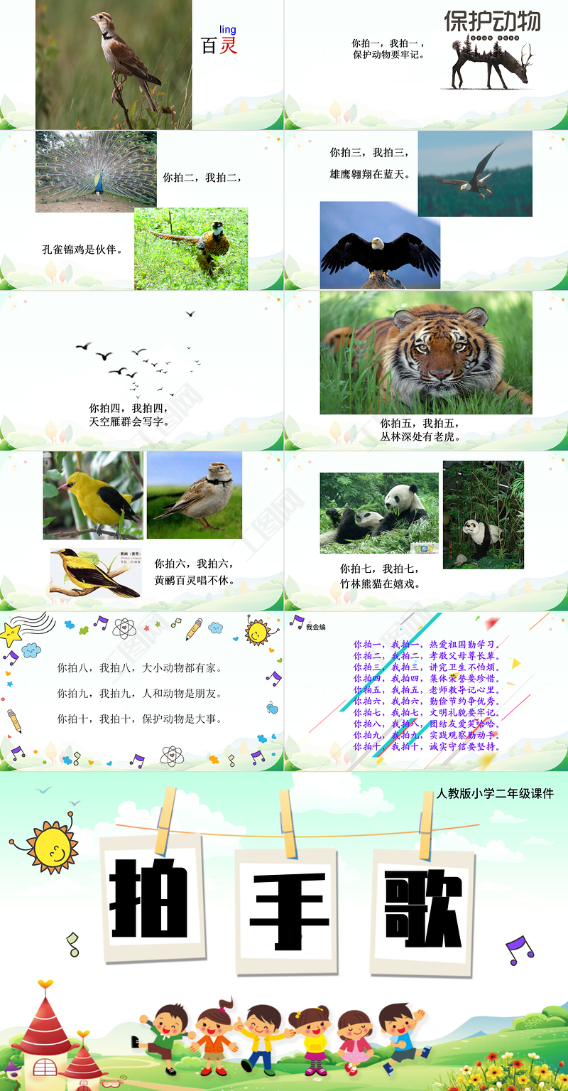 你拍六,我拍六,黃鸝百靈唱不休。你拍七,我拍七,竹林熊貓在嬉戲。你拍八,我拍八,大小動物都有家。你拍九,我拍九,人和動物是朋友。你拍十,我拍十,保護(hù)動物是大事。拍手歌