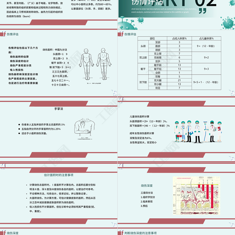 傷情評(píng)估傷情評(píng)估包括以下幾個(gè)方面: 燒傷面積的估算 燒傷深度的估計(jì) 燒傷嚴(yán)重程度分類 吸入性損傷燒傷面積和深度是估計(jì)燒傷嚴(yán)重程度的主要因素,也是進(jìn)行治療的重要依據(jù)燒傷面積:中國(guó)九分法 頭面頸= 1?9 雙上肢= 2?9 軀干 會(huì)陰= 3?9 臀 雙下肢= 5?9+1 三三三頭面頸, 五六七雙上肢, 五七十三二十一, 十三十三會(huì)陰一。
