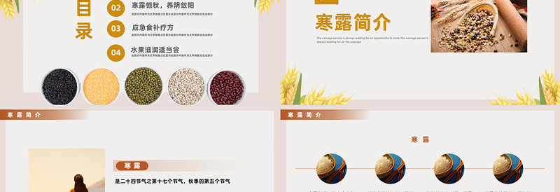 01寒露簡介此部分內(nèi)容作為文字排版占位顯示此部分內(nèi)容作為文字排版占位此部分02寒露驚秋,養(yǎng)陰斂陽此部分內(nèi)容作為文字排版占位顯示此部分內(nèi)容作為文字排版占位此部分03應(yīng)急食補療方此部分內(nèi)容作為文字排版占位顯示此部分內(nèi)容作為文字排版占位此部分04水果滋潤適當嘗此部分內(nèi)容作為文字排版占位顯示此部分內(nèi)容作為文字排版占位此部分目 錄