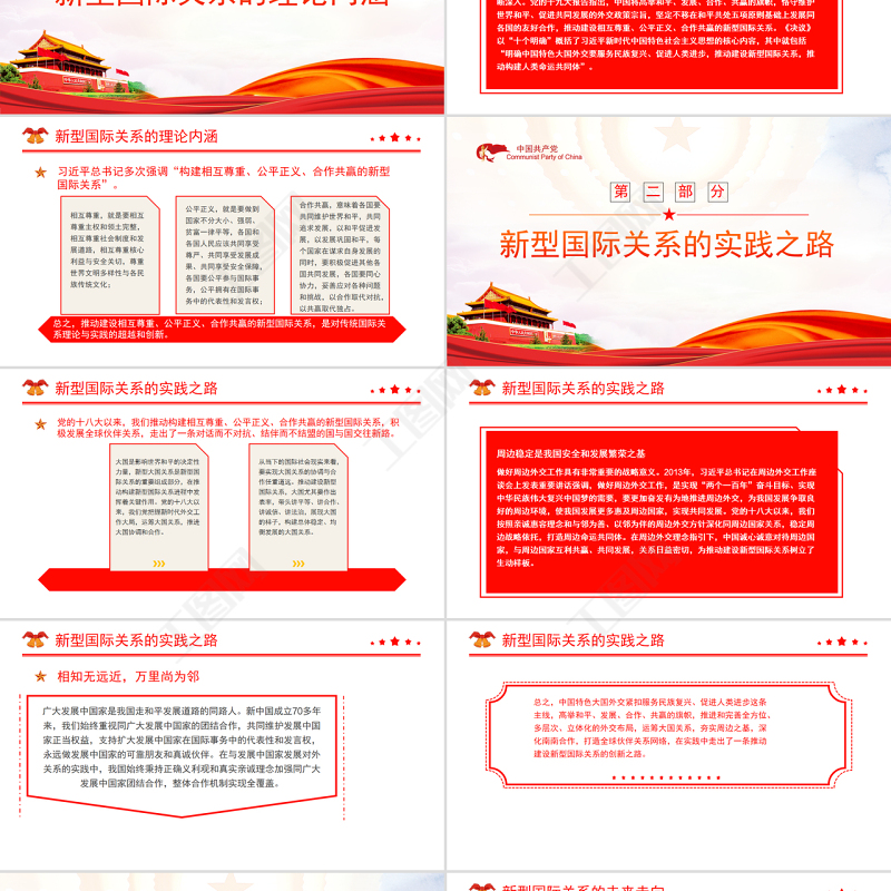 <p>推動建設(shè)新型國際關(guān)系—黨員干部學(xué)習(xí)教育專題黨課—</p><br><p>前 言QIAN YAN《中共中央關(guān)于黨的百年奮斗重大成就和歷史經(jīng)驗的決議》(以下簡稱《決議》)在“十個明確”中強調(diào)“推動建設(shè)新型國際關(guān)系”。黨的十八大以來,新型國際關(guān)系的理念與實踐創(chuàng)新不斷向前發(fā)展,得到了國際社會的廣泛認(rèn)可與普遍接受。當(dāng)前,世界百年變局和世紀(jì)疫情相互交織,盡管新型國際關(guān)系的建設(shè)面臨極大挑戰(zhàn),但沒有任何力量能夠阻擋歷史前進(jìn)的車輪。在習(xí)近平新時代中國特色社會主義思想指引下,推進(jìn)中國特色大國外交,推動建設(shè)新型國際關(guān)系,必將為國際社會注入更多正能量。</p><br><p>010203</p><br><p>新型國際關(guān)系的理論內(nèi)涵</p><br><p>新型國際關(guān)系的理論內(nèi)涵新型國際關(guān)系蘊含著豐富的理論內(nèi)涵,體現(xiàn)了和平共處五項原則在新的時代條件下的豐富和發(fā)展。早在2013年,習(xí)近平總書記就指出,面對國際形勢的深刻變化和世界各國同舟共濟的客觀要求,各國應(yīng)該共同推動建立以合作共贏為核心的新型國際關(guān)系。新型國際關(guān)系的命題一經(jīng)提出,就在國際社會引起強烈反響,對其理論內(nèi)涵的認(rèn)識與探索也不斷深入。黨的十九大報告指出,中國將高舉和平、發(fā)展、合作、共贏的旗幟,恪守維護(hù)世界和平、促進(jìn)共同發(fā)展的外交政策宗旨,堅定不移在和平共處五項原則基礎(chǔ)上發(fā)展同各國的友好合作,推動建設(shè)相互尊重、公平正義、合作共贏的新型國際關(guān)系?!稕Q議》以“十個明確”概括了習(xí)近平新時代中國特色社會主義思想的核心內(nèi)容,其中就包括“明確中國特色大國外交要服務(wù)民族復(fù)興、促進(jìn)人類進(jìn)步,推動建設(shè)新型國際關(guān)系,推動構(gòu)建人類命運共同體”。</p><br><p>習(xí)近平總書記多次強調(diào)“構(gòu)建相互尊重、公平正義、合作共贏的新型國際關(guān)系”。相互尊重,就是要相互尊重主權(quán)和領(lǐng)土完整,相互尊重社會制度和發(fā)展道路,相互尊重核心利益與安全關(guān)切,尊重世界文明多樣性與各民族傳統(tǒng)文化;公平正義,就是要做到國家不分大小、強弱、貧富一律平等,各國和各國人民應(yīng)該共同享受尊嚴(yán)、共同享受發(fā)展成果、共同享受安全保障,各國要公平參與國際事務(wù),公平擁有在國際事務(wù)中的代表性和發(fā)言權(quán);合作共贏,意味著各國要共同維護(hù)世界和平,共同追求發(fā)展,以和平促進(jìn)發(fā)展,以發(fā)展鞏固和平,每個國家在謀求自身發(fā)展的同時,要積極促進(jìn)其他各國共同發(fā)展,各國要同心協(xié)力,妥善應(yīng)對各種問題和挑戰(zhàn),以合作取代對抗,以共贏取代獨占。新型國際關(guān)系的理論內(nèi)涵總之,推動建設(shè)相互尊重、公平正義、合作共贏的新型國際關(guān)系,是對傳統(tǒng)國際關(guān)系理論與實踐的超越和創(chuàng)新。</p><br><p>新型國際關(guān)系的實踐之路</p><br><p>新型國際關(guān)系的實踐之路黨的十八大以來,我們推動構(gòu)建相互尊重、公平正義、合作共贏的新型國際關(guān)系,積極發(fā)展全球伙伴關(guān)系,走出了一條對話而不對抗、結(jié)伴而不結(jié)盟的國與國交往新路。大國是影響世界和平的決定性力量,新型大國關(guān)系是新型國際關(guān)系的重要組成部分,在推動構(gòu)建新型國際關(guān)系進(jìn)程中發(fā)揮著關(guān)鍵作用。黨的十八大以來,我們黨把握新時代外交工作大局,運籌大國關(guān)系,推進(jìn)大國協(xié)調(diào)和合作。從當(dāng)下的國際社會現(xiàn)實來看,要實現(xiàn)大國關(guān)系的協(xié)調(diào)與合作任重道遠(yuǎn)。推動建設(shè)新型國際關(guān)系,大國尤其要作出表率,帶頭講平等、講合作、講誠信、講法治,展現(xiàn)大國的樣子,構(gòu)建總體穩(wěn)定、均衡發(fā)展的大國關(guān)系。</p><br><p>做好周邊外交工作具有非常重要的戰(zhàn)略意義。2013年,習(xí)近平總書記在周邊外交工作座談會上發(fā)表重要講話強調(diào),做好周邊外交工作,是實現(xiàn)“兩個一百年”奮斗目標(biāo)、實現(xiàn)中華民族偉大復(fù)興中國夢的需要,要更加奮發(fā)有為地推進(jìn)周邊外交,為我國發(fā)展?fàn)幦×己玫闹苓叚h(huán)境,使我國發(fā)展更多惠及周邊國家,實現(xiàn)共同發(fā)展。黨的十八大以來,我們按照親誠惠容理念和與鄰為善、以鄰為伴的周邊外交方針深化同周邊國家關(guān)系,穩(wěn)定周邊戰(zhàn)略依托,打造周邊命運共同體。在周邊外交理念指引下,中國誠心誠意對待周邊國家,與周邊國家互利共贏、共同發(fā)展,關(guān)系日益密切,為推動建設(shè)新型國際關(guān)系樹立了生動樣板。新型國際關(guān)系的實踐之路周邊穩(wěn)定是我國安全和發(fā)展繁榮之基</p><br><p>相知無遠(yuǎn)近,萬里尚為鄰廣大發(fā)展中國家是我國走和平發(fā)展道路的同路人。新中國成立70多年來,我們始終重視同廣大發(fā)展中國家的團結(jié)合作,共同維護(hù)發(fā)展中國家正當(dāng)權(quán)益,支持?jǐn)U大發(fā)展中國家在國際事務(wù)中的代表性和發(fā)言權(quán),永遠(yuǎn)做發(fā)展中