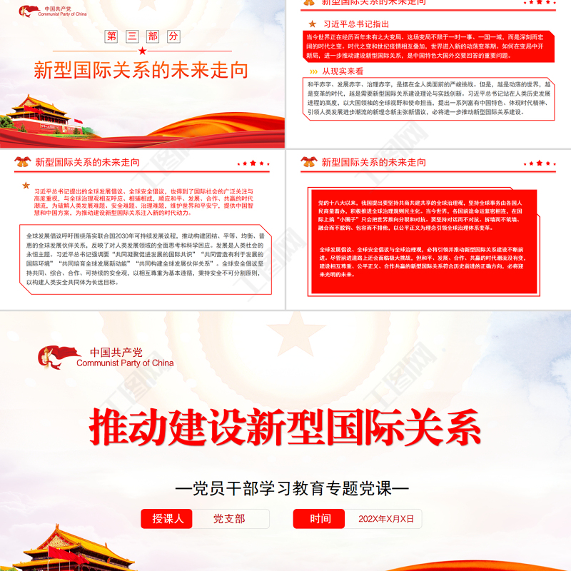 > 黨課PPT模板 > 推動建設(shè)新型國際關(guān)系PPT黨政風(fēng)黨員干部學(xué)習(xí)教育專題黨課課件模板.PPTX 【圖片、文字、動畫均可編輯】