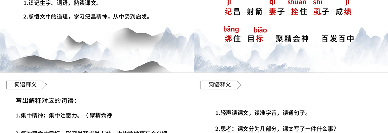 本課目標1.識記生字、詞語,熟讀課文。 2.感悟文中的道理,學(xué)習(xí)紀昌精神,從中受到啟發(fā)。
