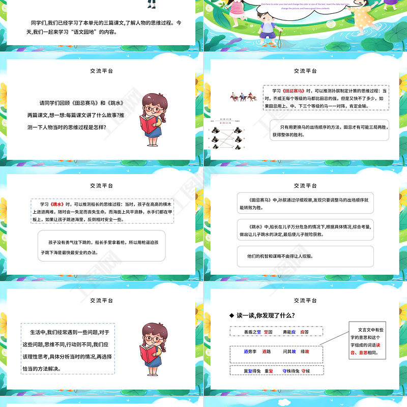 交流平臺請同學們回顧《田忌賽馬》和《跳水》兩篇課文,想一想:每篇課文講了什么故事?推測一下人物當時的思維過程是怎樣?
