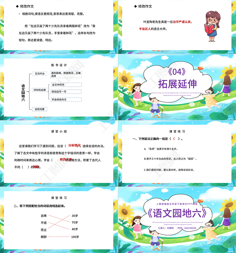 Click here to enter your text and change the color or size of the text. Insert the data text icon, change the picture, and have a good time.contents人教部編版五年級下冊語文PPT模板《語文園地六》匯報人:辦圖網(wǎng) 時間:2022/08/08