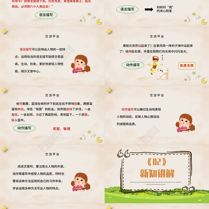閱讀文章時(shí),要注意從人物的外貌、動(dòng)作等描寫(xiě)中感受人物的品質(zhì),同時(shí)也要將這種方法運(yùn)用到自己的習(xí)作中去,學(xué)會(huì)運(yùn)用多種方法寫(xiě)出人物的特點(diǎn)。交流平臺(tái)
