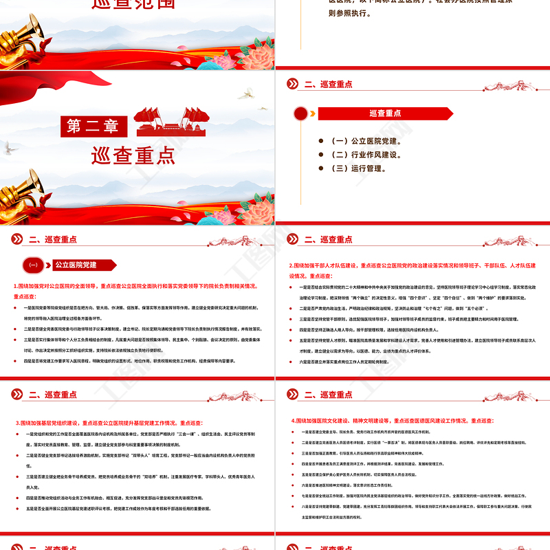 延遲符二、巡查重點3.圍繞加強(qiáng)基層黨組織建設(shè),重點巡查公立醫(yī)院提升基層黨建工作情況。重點巡查: 一是黨組織和黨的工作是否全面覆蓋醫(yī)院各內(nèi)設(shè)機(jī)構(gòu)及所屬各單位,黨支部是否嚴(yán)格執(zhí)行“三會一課”、組織生活會、民主評議黨員等制度,落實對黨員直接教育、管理、監(jiān)督,建立健全黨支部參與科室重要事項決策的制度機(jī)制。 二是是否健全黨支部書記選拔培養(yǎng)激勵機(jī)制,實施黨支部書記“雙帶頭人”培育工程,黨支部書記一般應(yīng)當(dāng)由內(nèi)設(shè)機(jī)構(gòu)負(fù)責(zé)人中的黨員擔(dān)任。 三是是否建立健全把業(yè)務(wù)骨干培養(yǎng)成黨員、把黨員培養(yǎng)成業(yè)務(wù)骨干的“雙培養(yǎng)”機(jī)制,注重發(fā)展醫(yī)療專家、學(xué)科帶頭人、優(yōu)秀青年醫(yī)務(wù)人員入黨。 四是是否推動黨組織活動與業(yè)務(wù)工作有機(jī)融合、相互促進(jìn),充分發(fā)揮黨支部戰(zhàn)斗堡壘和黨員先鋒模范作用。 五是是否全面開展公立醫(yī)院基層黨建述職評議考核,把黨建工作成效作為年度考核和干部選拔任用的重要依據(jù)。