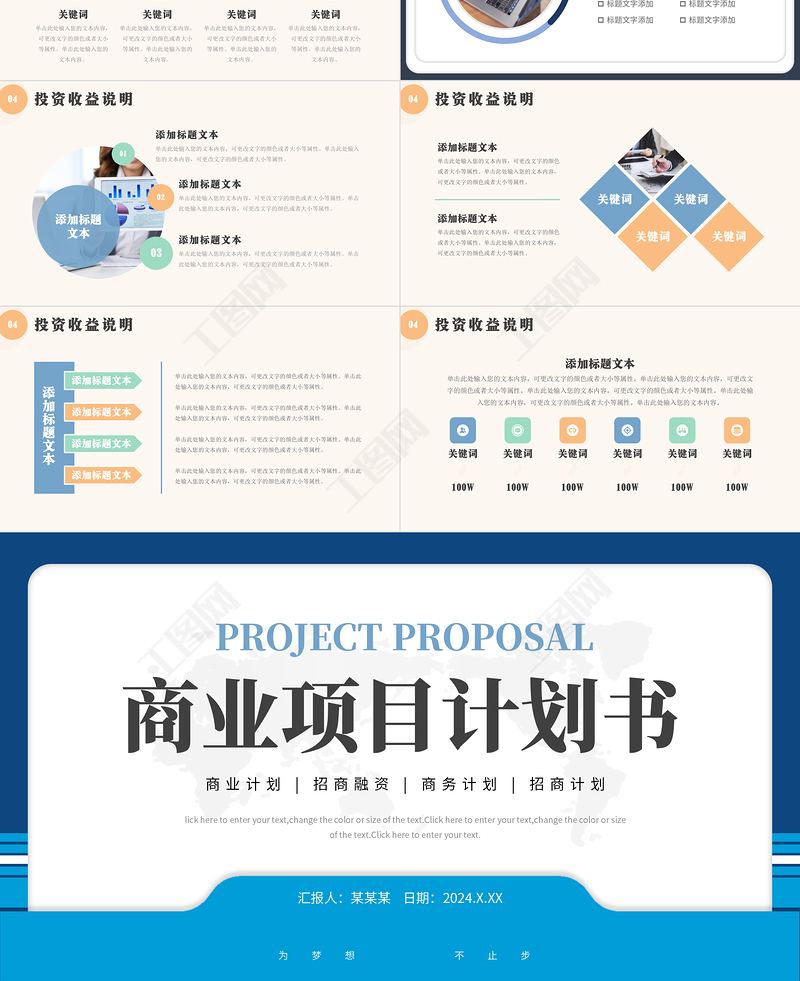 商業(yè)項(xiàng)目計(jì)劃書lick here to enter your text,change the color or size of the text.Click here to enter your text,change the color or size of the text.Click here to enter your text.匯報(bào)人:某某某 日期:2024.X.XX商業(yè)計(jì)劃 | 招商融資 | 商務(wù)計(jì)劃 | 招商計(jì)劃為夢(mèng)想 不止步PROJECT PROPOSAL