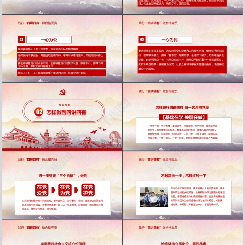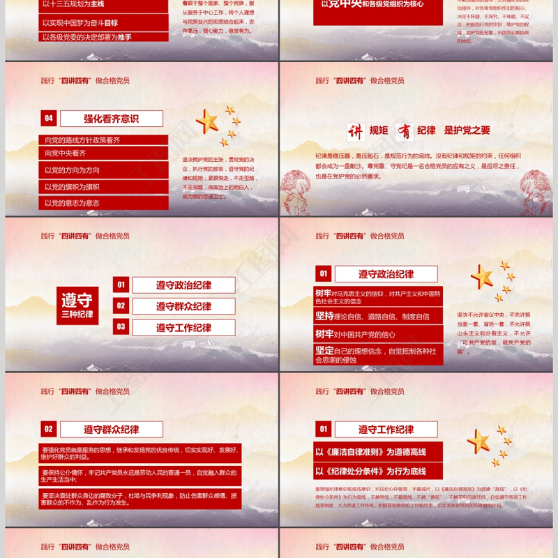踐行“四講四有”做合格黨員遵守政治紀律樹牢對馬克思主義的信仰,對共產(chǎn)主義和中國特色社會主義的信念堅持理論自信、道路自信、制度自信樹牢對中國共產(chǎn)黨的信心堅定自己的理想信念,自覺抵制各種社會思潮的侵蝕堅決不允許妄議中央,不充許搞當面一套、背后一套,不允許搞山頭主義和分裂主義,不允許“吃共產(chǎn)黨的飯,砸共產(chǎn)黨的鍋”。