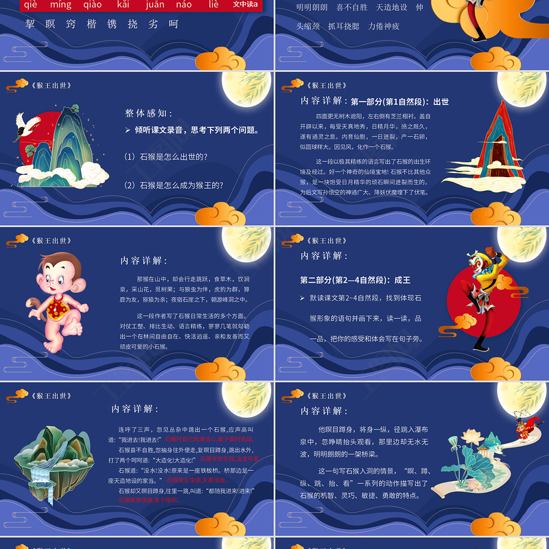 第二部分(第2—4自然段):成王默讀課文第2~4自然段,找到體現(xiàn)石猴形象的語(yǔ)句并畫(huà)下來(lái),讀一讀,品一品,把你的感受和體會(huì)寫(xiě)在句子旁。內(nèi)容詳解: