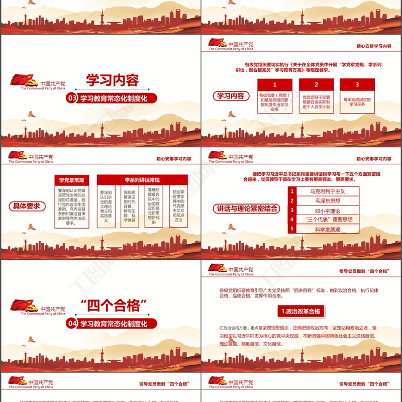 精心安排學(xué)習(xí)內(nèi)容具體要求學(xué)黨章常規(guī)要深刻認(rèn)識(shí)黨章是管黨治黨的總規(guī)矩總遵循,踐行黨內(nèi)政治生活準(zhǔn)則、黨內(nèi)監(jiān)督條例和廉潔自律準(zhǔn)則等黨內(nèi)法規(guī)要求。學(xué)系列講話(huà)常規(guī)要深刻認(rèn)識(shí)講話(huà)的重大理論意義和實(shí)踐意義深刻理解講話(huà)的時(shí)代背景、鮮明主題、科學(xué)體系準(zhǔn)確把握蘊(yùn)含其中的治國(guó)理政新理念新思想新戰(zhàn)略領(lǐng)會(huì)掌握貫穿其中的馬克思主義立場(chǎng)觀點(diǎn)方法