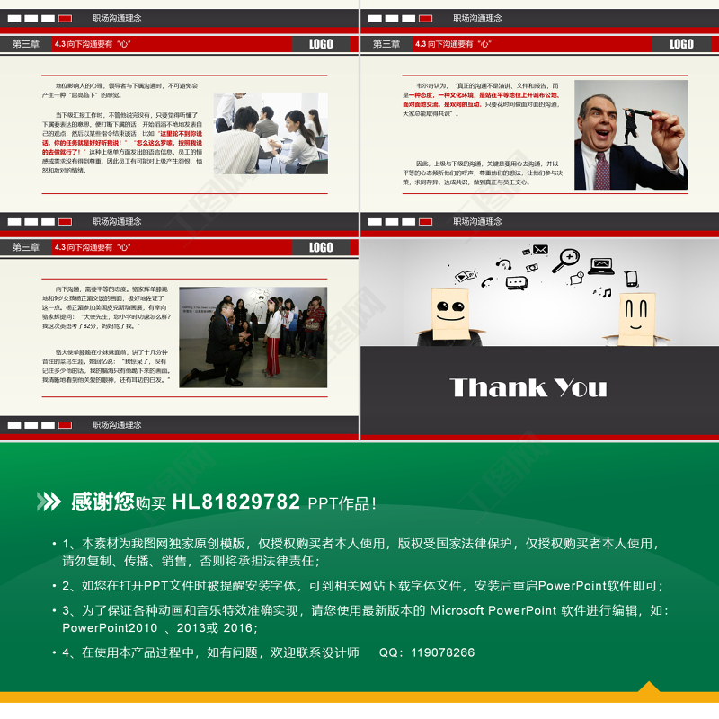 感謝您購買 HL81829782 PPT作品!更多精品模版: http://hi.888ppt.com/hl81829782/tuku/1、本素材為辦圖網(wǎng)獨(dú)家原創(chuàng)模版,僅授權(quán)購買者本人使用,版權(quán)受國家法律保護(hù),僅授權(quán)購買者本人使用,請勿復(fù)制、傳播、銷售,否則將承擔(dān)法律責(zé)任;2、如您在打開PPT文件時(shí)被提醒安裝字體,可到相關(guān)網(wǎng)站下載字體文件,安裝后重啟PowerPoint軟件即可;3、為了保證各種動畫和音樂特效準(zhǔn)確實(shí)現(xiàn),請您使用最新版本的 Microsoft PowerPoint 軟件進(jìn)行編輯,如:PowerPoint2010 、2013或 2016;4、在使用本產(chǎn)品過程中,如有問題,歡迎聯(lián)系設(shè)計(jì)師 QQ:119078266
