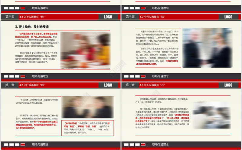 韋爾奇認(rèn)為,“真正的溝通不是演講、文件和報(bào)告,而是一種態(tài)度,一種文化環(huán)境,是站在平等地位上開誠布公地、面對面地交流,是雙向的互動。只要花時(shí)間做面對面的溝通,大家總能取得共識”。職場溝通理念 第三章4.3 向下溝通要有“心” LOGO因此,上級與下級的溝通,關(guān)鍵是要用心去溝通,并以平等的心態(tài)傾聽他們的呼聲,尊重他們的想法,讓他們參與決策,求同存異,達(dá)成共識,做到真正與員工交心。