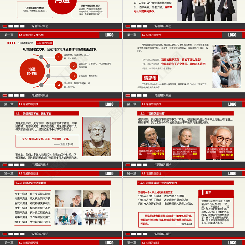 1.2.1 溝通無處不在,無時(shí)不有溝通無處不在,無時(shí)不有。不論是語言或非語言、文字或符號、有意或無意、積極或消極,溝通是我們每個人每天都要做的事兒,是我們生活中必不可少的部分。事實(shí)上,我們大多數(shù)人花費(fèi)50%-75%的工作時(shí)間,以書面形式、面對面的形式或打電話等多種方式進(jìn)行溝通。一個人不和別人打交道,不是一個神就是一個獸?!?亞里士多德溝通知識概述 第一章1.2 溝通的重要性 LOGO