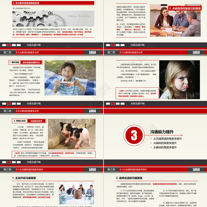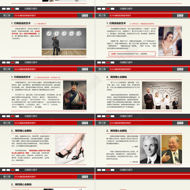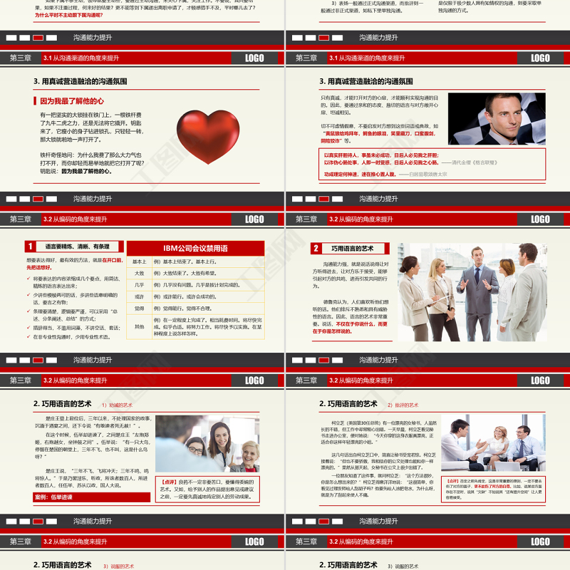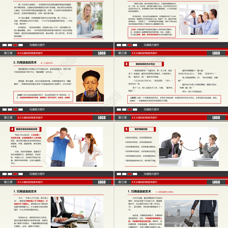 3)詢問互動,盡量挖掘充足的信息當(dāng)老婆剛剛沖完澡出來,老公正要開始淋浴時(shí),門鈴響了,在幾秒爭吵誰該去開門之后,老婆放棄了,裹了條毛巾急忙下去開門。她打開門,看見Bob,他們的鄰居。在她還沒開口之前,Bob就說“如果你把那條毛巾拿下我就給你$800”。溝通能力提升 第三章3.3 從編碼的角度來提升 LOGO1. 巧用語言的藝術(shù)老婆想了想,就脫下毛巾,赤裸站在Bob面前,過了幾秒Bob給了錢就走了。老婆興奮她的好運(yùn),裹上毛巾上樓。她回到浴室,老公問她:“剛剛是誰呀?”“隔壁的Bob啦”她回答。 “很好”老公說:“那他有沒有拿他欠我的$800還我呢?”【點(diǎn)評】未獲得充足的信息就匆匆下結(jié)論,多難堪啊!
