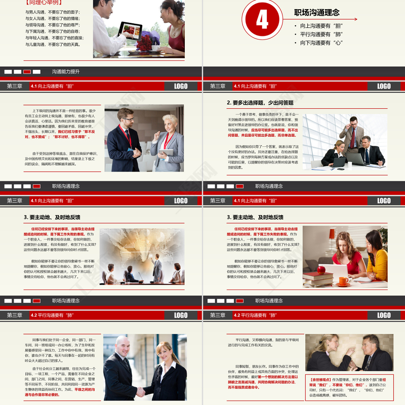 任何已經(jīng)安排下來的事項(xiàng),當(dāng)領(lǐng)導(dǎo)主動去提醒或追問的時(shí)候,是下屬工作失敗的表現(xiàn)。作為一個職業(yè)人,一件事交給你去做,你如何做的,進(jìn)展到什么程度,有沒有做好,收到了什么實(shí)效?這些問題永遠(yuǎn)都不要等到領(lǐng)導(dǎo)問你時(shí)才回答。職場溝通理念 第三章4.1 向上溝通要有“膽” LOGO3. 要主動地、及時(shí)地反饋假如你能夠不要讓你的領(lǐng)導(dǎo)象秘書一樣不斷地提醒你,假如你能夠讓他省心、放心。那他對你的認(rèn)可和授權(quán)就會越來越大,幾次下來以后,事情交待給你,他也就不會再過問了。