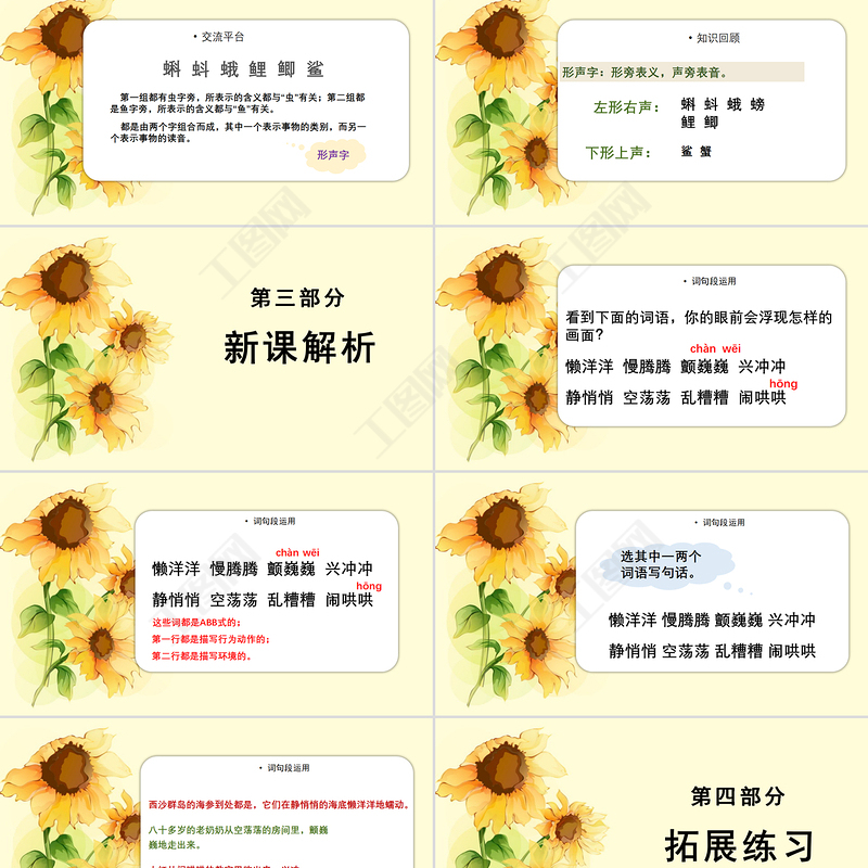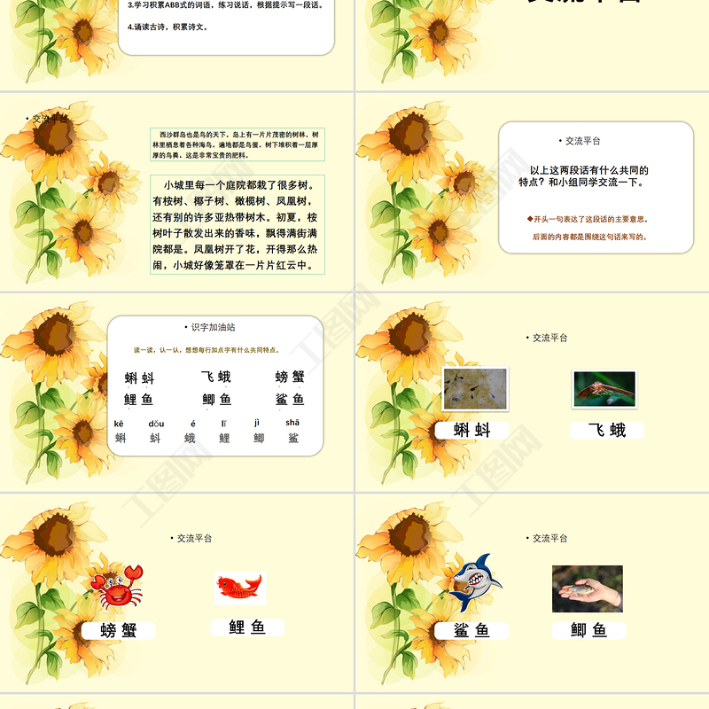 教學(xué)目標(biāo)1.找出中心句及其在文中可能出現(xiàn)的位置。 2.認(rèn)識表示動物的詞語,認(rèn)識帶有蟲字旁和魚字旁的字。 3.學(xué)習(xí)積累ABB式的詞語,練習(xí)說話,根據(jù)提示寫一段話。 4.誦讀古詩,積累詩文。