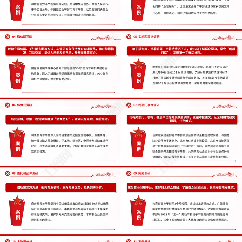 充分借助網(wǎng)絡(luò)平臺(tái),走好網(wǎng)上群眾路線,了解群眾所思所愿,收集好想法好建議。09 網(wǎng)絡(luò)調(diào)研案例教育部青年干部用2個(gè)月時(shí)間,通過線上調(diào)研的方式,廣泛搜集國家智慧教育公共服務(wù)平臺(tái)用戶的體驗(yàn)情況。文化和旅游部青年干部對(duì)2022 年“五一”勞動(dòng)節(jié)和端午節(jié)假期的網(wǎng)絡(luò)輿情進(jìn)行分析匯總,從中了解疫情背景下人民群眾的假日文化和旅游需求。
