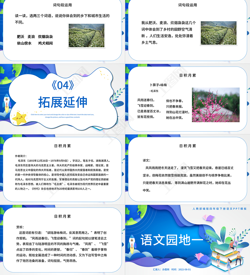 人教部編版四年級(jí)下冊(cè)語(yǔ)文PPT模板語(yǔ)文園地一匯報(bào)人:辦圖網(wǎng) 時(shí)間:2022-08-01