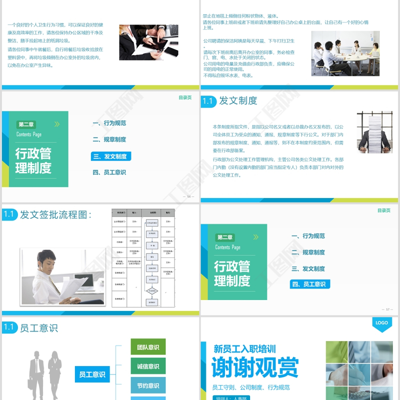 一、入職流程二、勞動合同三、考勤制度四、請假制度五、休假制度六、加班和調(diào)休制度七、薪酬管理制度八、公司福利人事管理制度三、發(fā)文制度四、員工意識行政管理制度一、行為規(guī)范二、規(guī)章制度