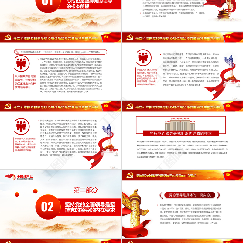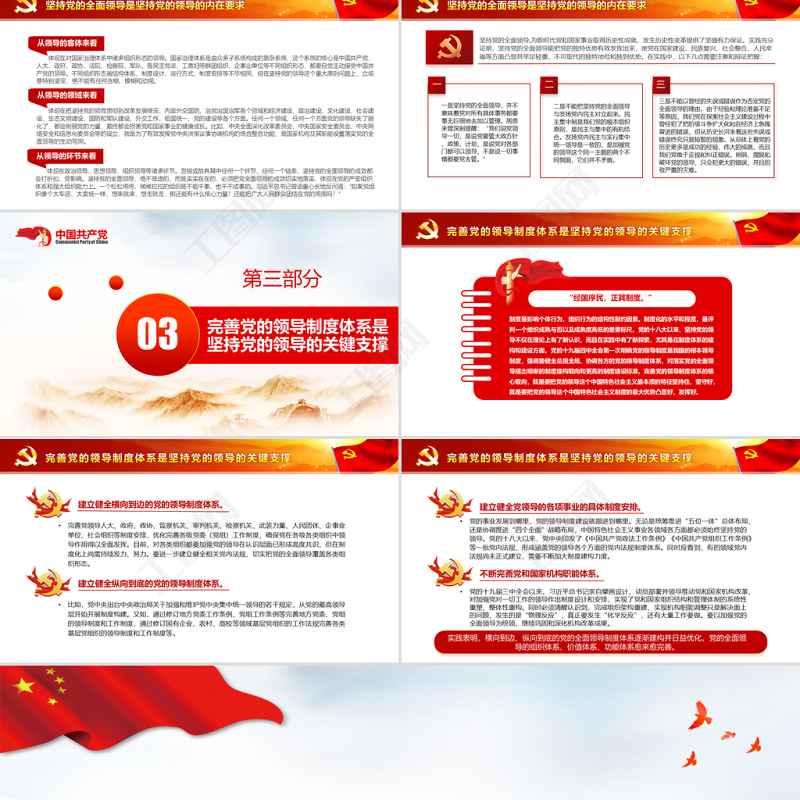 <p>——深入學習《決議》專題黨課課件模板——始終不渝堅持黨的領導</p><br><p>前 言堅持黨的領導是我們黨百年奮斗積累的最重要、最深刻、最根本的歷史經(jīng)驗,也是新時代中國特色社會主義最突出的原創(chuàng)性思想、變革性實踐、突破性進展、標志性成果。黨的十九屆六中全會通過的《中共中央關于黨的百年奮斗重大成就和歷史經(jīng)驗的決議》在總結我們黨百年奮斗的十條歷史經(jīng)驗中,第一條就是“堅持黨的領導”;在總結新時代黨和國家事業(yè)取得歷史性成就、發(fā)生歷史性變革的十三個領域中,第一個就是“堅持黨的全面領導”;在對習近平新時代中國特色社會主義思想核心要義凝練的“十個明確”中,第一個“明確”就是“明確中國特色社會主義最本質(zhì)的特征是中國共產(chǎn)黨領導,中國特色社會主義制度的最大優(yōu)勢是中國共產(chǎn)黨領導,中國共產(chǎn)黨是最高政治領導力量,全黨必須增強‘四個意識’、堅定‘四個自信’、做到‘兩個維護’”。</p><br><p>1確立和維護黨的領導核心地位是堅持黨的領導的根本前提目錄2堅持黨的全面領導是堅持黨的領導的內(nèi)在要求3完善黨的領導制度體系是堅持黨的領導的關鍵支撐</p><br><p>確立和維護黨的領導核心地位是堅持黨的領導的根本前提第一部分</p><br><p>確立和維護黨的領導核心地位是堅持黨的領導的根本前提領導核心對于任何一個政黨、任何一個國家、任何一個社會而言,都具有極其深刻的現(xiàn)實價值和戰(zhàn)略意義。一方面,領導核心是建構政治認同、優(yōu)化政治整合、凝聚政治共識的關鍵要素,從而形塑價值、組織、制度的一體化發(fā)展結構形態(tài);另一方面,領導核心是增進政治秩序、維系社會穩(wěn)定、促推社會整合的黏合劑。這對于從傳統(tǒng)國家向現(xiàn)代國家轉型之中的發(fā)展中國家而言,顯得尤為重要。現(xiàn)代化的實踐經(jīng)驗表明,后發(fā)國家實現(xiàn)現(xiàn)代化,其基本前提是要有長期穩(wěn)定的政治秩序的鼎力支撐,而領導核心對于這樣一種秩序的建構不可或缺。正是在這個意義上,習近平總書記得出這樣一個明晰深刻的判斷:“一個國家、一個政黨,領導核心至關重要?!?lt;/p><br><p>確立和維護黨的領導核心地位是堅持黨的領導的根本前提在我們黨的話語體系中,“領導核心”主要有三個應用語境,具體可從以下三個維度分析。堅持無產(chǎn)階級政黨在社會主義事業(yè)中的領導地位,是科學社會主義基本原則之一。在馬克思、恩格斯看來,無論是促進無產(chǎn)階級斗爭從自發(fā)走向自覺并最終取得勝利,還是無產(chǎn)階級通過革命斗爭建立無產(chǎn)階級專政國家政權,都應該而且必須由在實踐和理論方面具有先進性的無產(chǎn)階級政黨的領導才能最終得以實現(xiàn),這是無產(chǎn)階級踐履推翻舊世界、建構新世界歷史使命的關鍵所在。1954年9月15日,毛澤東在一屆全國人大一次會議上的開幕詞中指明:“領導我們事業(yè)的核心力量是中國共產(chǎn)黨?!绷暯娇倳泩猿挚茖W社會主義基本原則,在不同場合反復強調(diào)“黨是我們各項事業(yè)的領導核心”,要始終確保我們黨處在總攬全局、協(xié)調(diào)各方的領導核心地位。正因為有中國共產(chǎn)黨的堅強有力領導,我國才能在異常復雜的國內(nèi)外環(huán)境下實現(xiàn)了從幾千年封建專制政治向人民民主的偉大飛躍,實現(xiàn)了一窮二白、人口眾多的東方大國邁進社會主義社會的偉大飛躍,中華民族才迎來了從站起來、富起來到強起來的偉大飛躍。</p><br><p>確立和維護黨的領導核心地位是堅持黨的領導的根本前提習近平總書記曾比喻道,在國家治理體系的大棋局中,黨中央是坐鎮(zhèn)中軍帳的“帥”,車馬炮各展其長,一盤棋大局分明。他還曾舉例談道:“戰(zhàn)爭年代,黨中央和毛主席用電臺指揮全黨全軍,‘嘀嗒、嘀嗒’就是黨中央和毛主席的聲音,全黨全軍都無條件執(zhí)行。大家想想,如果黨中央發(fā)出的號令沒人聽,做不到令行禁止,那還談什么維護黨中央權威和集中統(tǒng)一領導!”黨中央權威和集中統(tǒng)一領導、黨中央有一錘定音的高度權威,是全黨思想統(tǒng)一和步調(diào)一致的根本前提,是確保黨和國家前進方向正確和形成巨大合力的關鍵要素。</p><br><p>確立和維護黨的領導核心地位是堅持黨的領導的根本前提黨的偉大領袖,在推動社會歷史進步中往往發(fā)揮著特殊的積極作用。黨確立習近平同志黨中央的核心、全黨的核心地位,反映了全黨全軍全國各族人民的共同心愿,對新時代黨和國家事業(yè)發(fā)展、對推進中華民族偉大復興歷史進程具有決定性意義。習近平總書記以馬克思主義政治家、思想家、戰(zhàn)略家的非凡理論勇氣、卓越政治智慧、強烈使命擔當,以“我將無我,不負人民”的赤子情懷,提出一系列原創(chuàng)性的治國理政新理念新思想新戰(zhàn)略,為習近平新時代中國特色社會主義思想的創(chuàng)立發(fā)揮了決定性作用、作出了決定性貢獻。堅定擁護和維護習近平總書記的核心地位,全黨就有“定盤星”,全國人民就有“主心骨”,中華“復興”號巨輪就有掌舵者,面對驚濤駭浪我們就能夠做到“任憑風浪起、穩(wěn)坐釣魚船”。</p><br><p>確立和維護黨的領導核心地位是堅持黨的領導的根本前提我們這