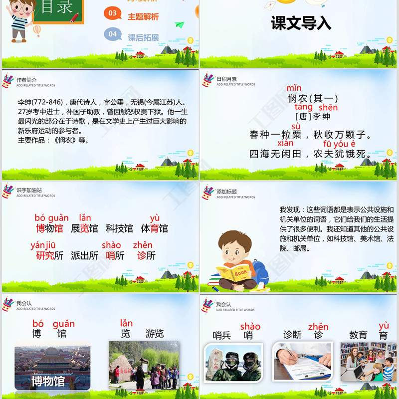 憫農(nóng)鋤禾日當午,汗滴禾下土。誰知盤中餐,粒粒皆辛苦。拓展閱讀ADD RELATED TITLE WORDS