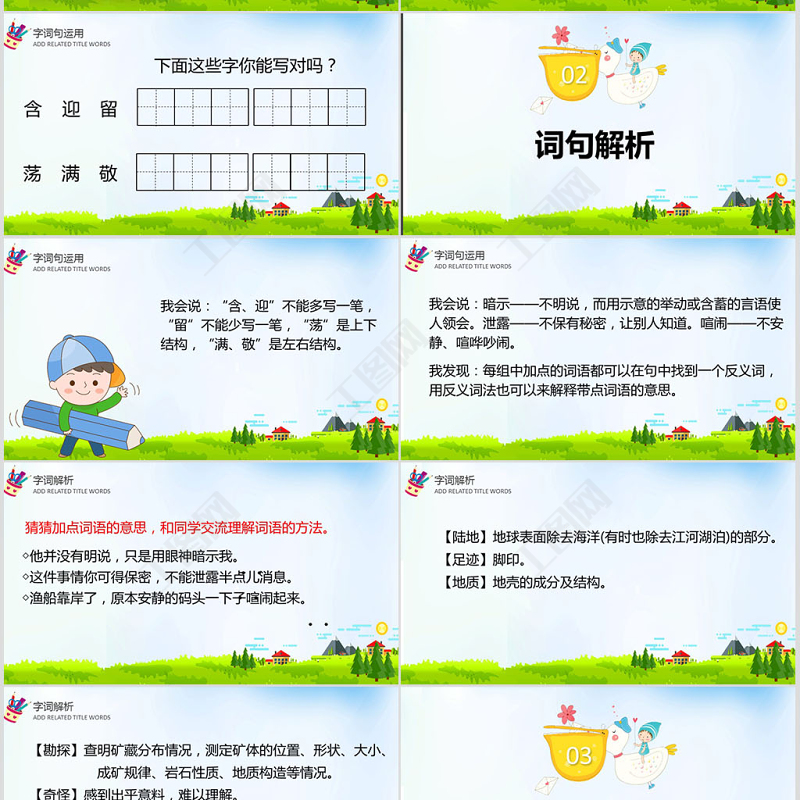 【陸地】地球表面除去海洋(有時也除去江河湖泊)的部分。【足跡】腳印。【地質(zhì)】地殼的成分及結(jié)構(gòu)。字詞解析ADD RELATED TITLE WORDS