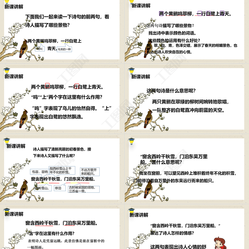 初讀感知 絕句 【唐】杜甫 兩個(gè)黃鸝鳴翠柳, 一行白鷺上青天。 窗含西嶺千秋雪, 門泊東吳萬里船。