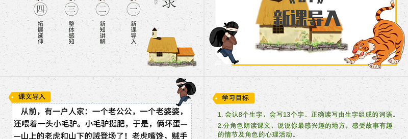 從前,有一戶人家:一個(gè)老公公,一個(gè)老婆婆,還喂著一頭小毛驢。小毛驢挺肥,于是,倆壞蛋——山上的老虎和山下的賊登場了!老虎嘴饞,賊手癢,在一天晚上,下著蒙蒙小雨,他們躡手躡腳地來了……后邊發(fā)生了很多有趣的事情,快來讀一讀吧!課文導(dǎo)入