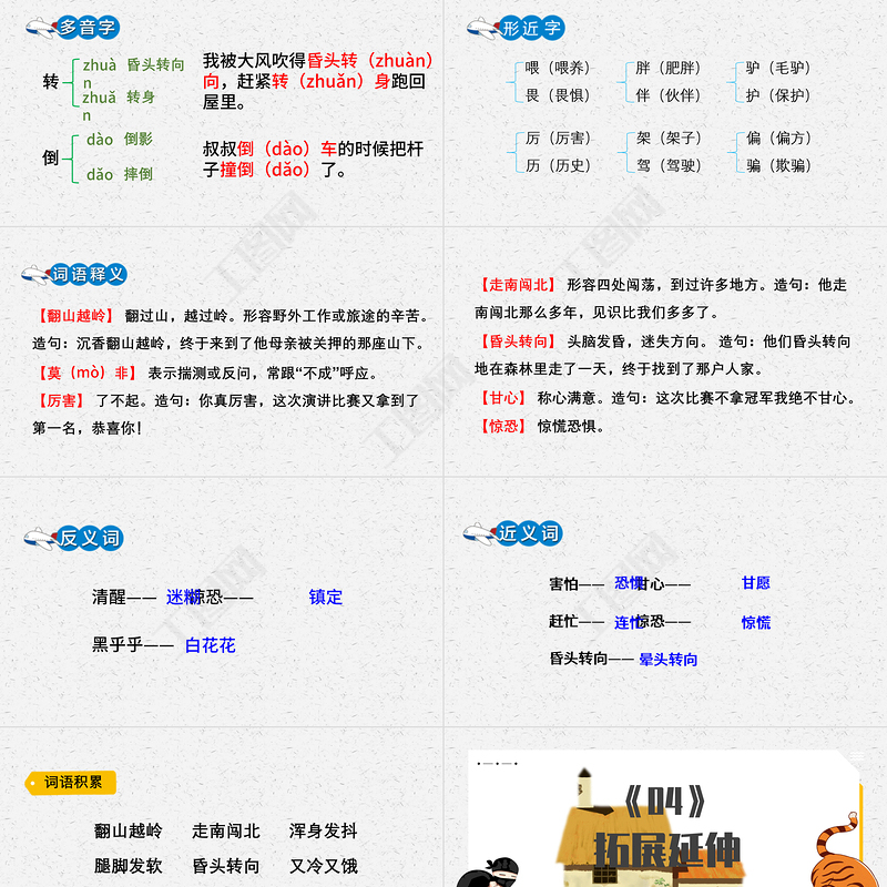 詞語積累翻山越嶺 走南闖北 渾身發(fā)抖 腿腳發(fā)軟 昏頭轉(zhuǎn)向 又冷又餓 又濕又滑 緊爬慢爬 安安穩(wěn)穩(wěn)