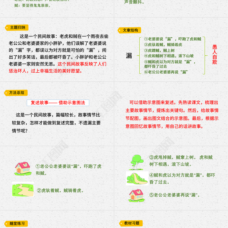 文章結(jié)構(gòu)漏愚人自欺①老婆婆說“漏”,嚇跑了虎和賊②虎馱著賊,賊騎著虎③虎蹭賊,賊上樹④虎和賊樹下相遇,滾下山坡⑤賊和虎以為對方就是“漏”,都嚇昏了過去⑥老公公老婆婆再說“漏”