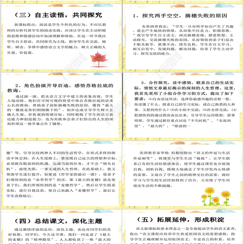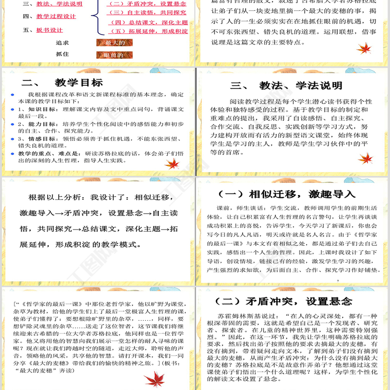 (四)總結(jié)課文,深化主題 通過(guò)激情洋溢的總結(jié),深化主題,表達(dá)對(duì)同學(xué)們的美好祝愿:同學(xué)們,今天這節(jié)課,我們一同走進(jìn)了《最大的麥穗》的“精神殿堂”。人人都收獲了一株“最大的麥穗”,我們不虛此行。蘇格拉底告訴我們,生活實(shí)踐也告訴我們,名人名言告訴我們,一定要抓住眼前的機(jī)遇,完成當(dāng)前的任務(wù),這樣才不會(huì)虛度光陰,一事無(wú)成。我相信大家,在你人生旅途中你一定會(huì)更聰明,一定更會(huì)抓住機(jī)遇!