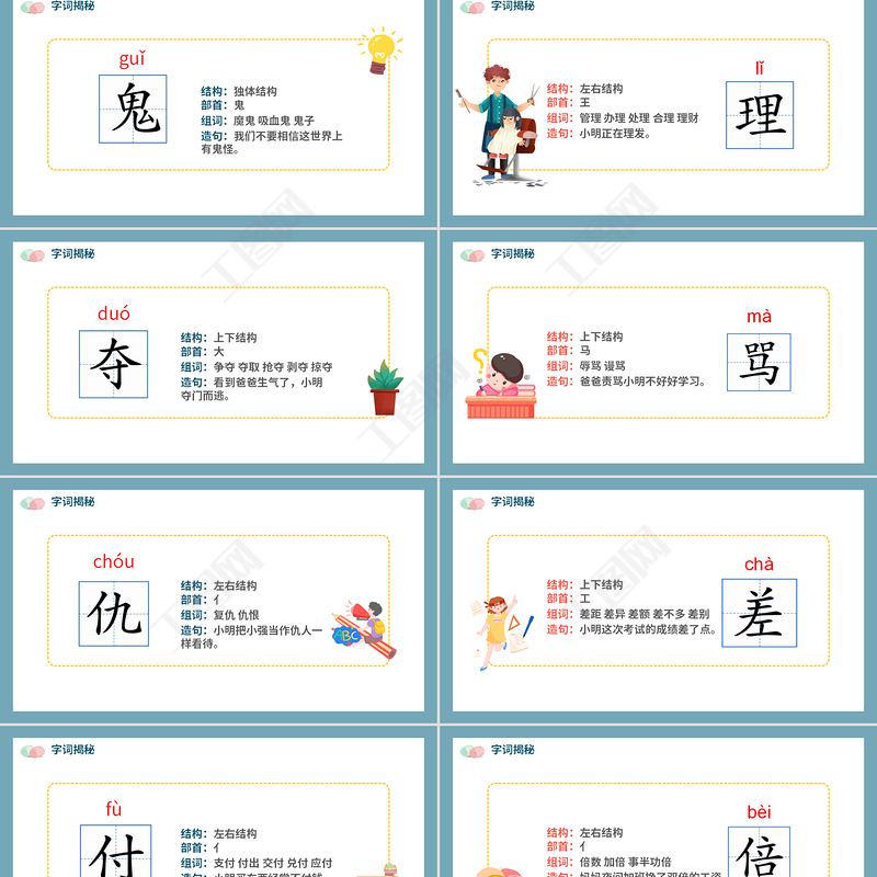 字詞揭秘結(jié)構(gòu):獨體結(jié)構(gòu)組詞:魔鬼 吸血鬼 鬼子造句:我們不要相信這世界上有鬼怪。 部首:鬼guǐ