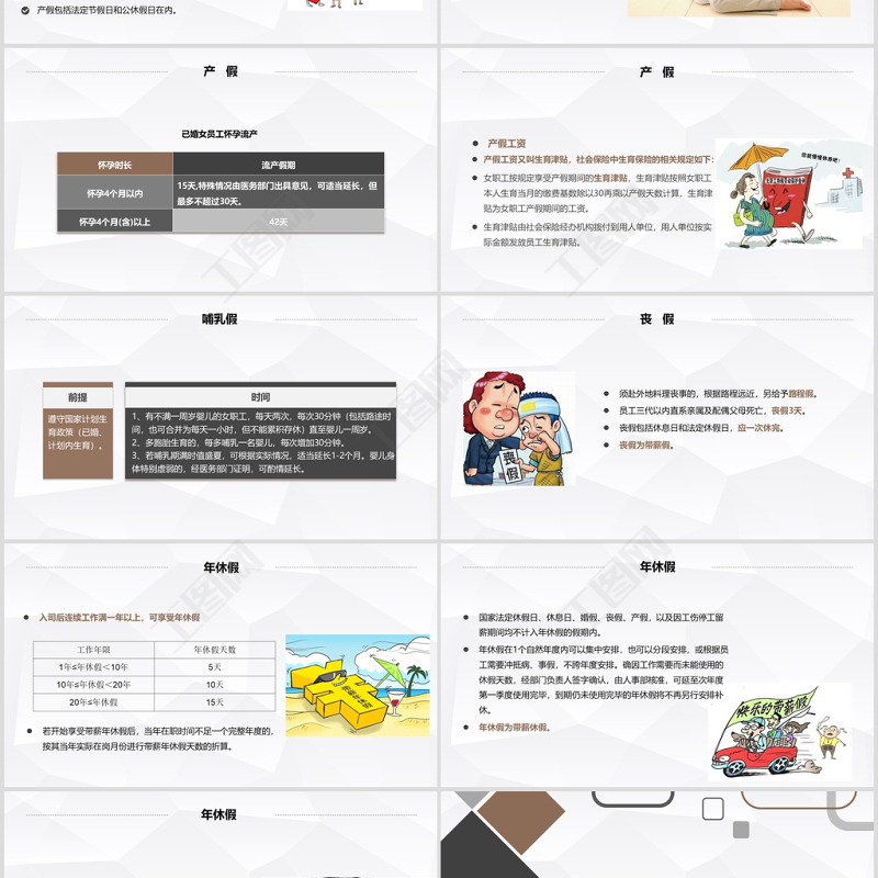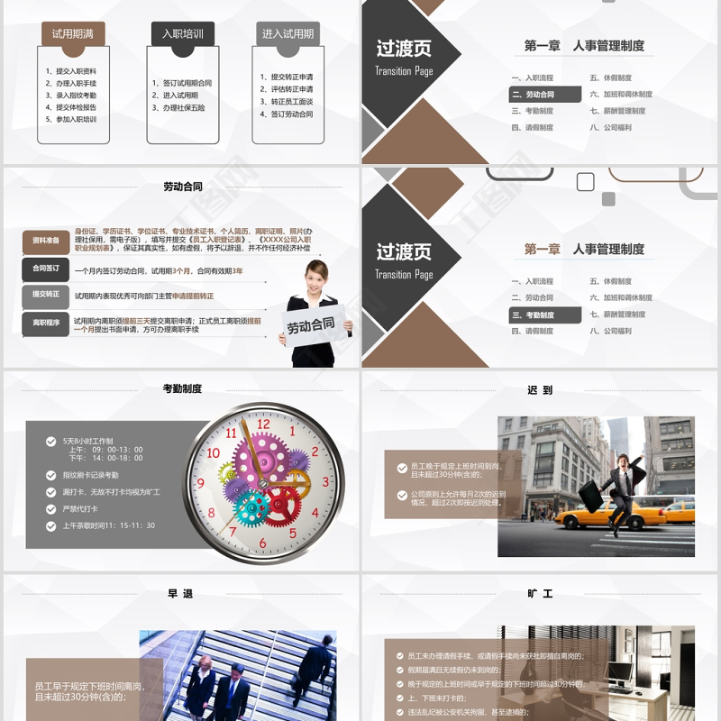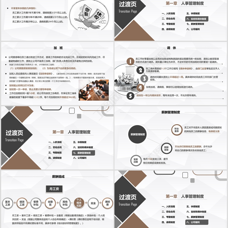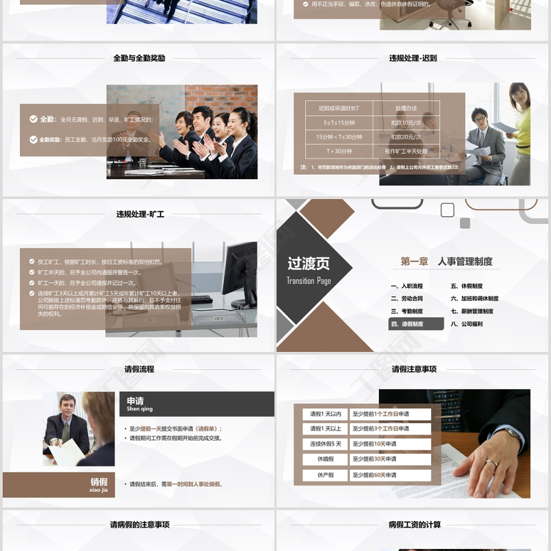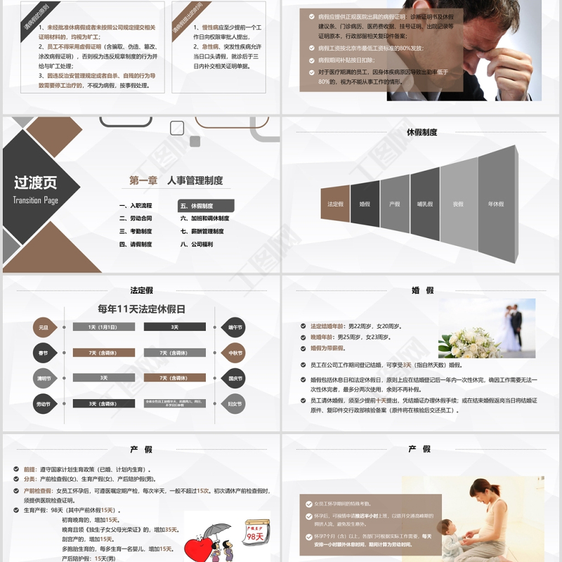 <p>LOGO員工入職培訓手冊Professional Commercial Project Plan這里可以輸入副標題或其他說明文字</p><br><p>一、入職流程二、勞動合同三、考勤制度四、請假制度五、休假制度六、加班和調(diào)休制度七、薪酬管理制度八、公司福利三、發(fā)文制度四、員工意識一、行為規(guī)范二、規(guī)章制度</p><br><p>第一章 人事管理制度一、入職流程二、勞動合同三、考勤制度四、請假制度五、休假制度六、加班和調(diào)休制度七、薪酬管理制度八、公司福利一、入職流程</p><br><p>入 職 流 程試用期滿1、提交入職資料2、辦理入職手續(xù)3、錄入指紋考勤4、提交體檢報告5、參加入職培訓1、簽訂試用期合同2、進入試用期3、辦理社保五險1、提交轉(zhuǎn)正申請2、評估轉(zhuǎn)正申請3、轉(zhuǎn)正員工面談4、簽訂勞動合同入職培訓進入試用期</p><br><p>第一章 人事管理制度一、入職流程二、勞動合同三、考勤制度四、請假制度五、休假制度六、加班和調(diào)休制度七、薪酬管理制度八、公司福利二、勞動合同</p><br><p>勞動合同</p><br><p>第一章 人事管理制度一、入職流程二、勞動合同三、考勤制度四、請假制度五、休假制度六、加班和調(diào)休制度七、薪酬管理制度八、公司福利三、考勤制度</p><br><p>考勤制度5天8小時工作制 上午: 09:00-13:00 下午: 14:00-18:00 指紋刷卡記錄考勤漏打卡、無故不打卡均視為曠工嚴禁代打卡上午茶歇時間11:15-11:30</p><br><p>遲 到員工晚于規(guī)定上班時間到崗、且未超過30分鐘(含)的;公司原則上允許每月2次的遲到情況,超過2次即按遲到處理。</p><br><p>早 退員工早于規(guī)定下班時間離崗,且未超過30分鐘(含)的;</p><br><p>曠 工員工未辦理請假手續(xù),或請假手續(xù)尚未獲批即擅自離崗的;假期屆滿且無續(xù)假仍未到崗的;晚于規(guī)定的上班時間或早于規(guī)定的下班時間超過30分鐘的;上、下班未打卡的;違法亂紀被公安機關(guān)拘留、甚至逮捕的;用不正當手段,騙取、涂改、偽造休息休假證明的。 </p><br><p>全勤與全勤獎勵全勤:全月無請假、遲到、早退、曠工情況的;全勤獎勵:員工全勤,當月獎勵100元全勤獎金。</p><br><p>違規(guī)處理-遲到注: 1、所罰款項將作為所屬部門的活動經(jīng)費 2、原則上公司允許員工善意遲到2次</p><br><p>員工曠工,根據(jù)曠工時長,按日工資標準的雙倍扣罰。曠工半天的,另予全公司內(nèi)通報并警告一次。曠工一天的,另予全公司通報并記過一次。連續(xù)曠工3天以上或月累計曠工5天或年累計曠工10天以上者,公司除按上述標準罰考勤款外,還將與其解約,且不予支付任何可能存在的經(jīng)濟補償金或賠償金等,并保留向其追索權(quán)益損失的權(quán)利。違規(guī)處理-曠工</p><br><p>第一章 人事管理制度一、入職流程二、勞動合同三、考勤制度四、請假制度五、休假制度六、加班和調(diào)休制度七、薪酬管理制度八、公司福利四、請假制度</p><br><p>請假流程銷假申請至少提前一天提交書面申請《請假單》;請假期間工作需在假期開始前完成交接。請假結(jié)束后,需第一時間到人事處銷假。xiao jiaShen qing</p><br><p>請假注意事項</p><br><p>請病假的注意事項1、未經(jīng)批準休病假或者未按照公司規(guī)定提交相關(guān)證明材料的,均視為曠工;2、員工不得采用虛假證明(含騙取、偽造、篡改、涂改病假證明),否則視為違反規(guī)章制度的行為并給與曠工處理;3、因違反治安管理規(guī)定或者自殺、自殘的行為導致需要停工治療的,不視為病假,按事假處理。</p><br><p>病假工資的計算病假應(yīng)提供正規(guī)醫(yī)院出具的病假證明:診斷證明書及休假建議條、門診病歷、醫(yī)藥費收據(jù)、掛號證明、出院記錄等證明原本,行政部留相關(guān)復印件備案;病假工資按北京市最低工資標準的80%發(fā)放; 病假期間補貼按日扣除;對于醫(yī)療期滿的員工,因身體疾病原因?qū)е鲁銮诼实陀?0%的,視為不能從事工作的情形。</p><br><p>第一章 人事管理制度一、入職流程二、勞動合同三、考勤制度四、請假制度五、休假制度六、加班和調(diào)休制度七、薪酬管理制度八、公司福利五、休假制度</p><br><p>休假制度</p><br><p>法定假 每年11天法定休假日1天(1月1日)7天(含調(diào)休)3天3天(含調(diào)休)3天7天(含調(diào)休)7天(含調(diào)休)全體女性員工放假半天,若遇周六、周日,不予另行補假</p><br><p>婚 假法定結(jié)婚年齡:男22周歲,女20周歲。 晚婚年齡:男25周歲,女23周歲。 婚假為帶薪假?;榧侔ㄐ菹⑷蘸头ǘㄐ菁偃?,原則上應(yīng)在結(jié)婚登記后一年內(nèi)一次性休完,確因工作需要無法一次性休完者,最多分兩次使用,余則不再補假。員工請休婚假,須至少提前十天提出,憑結(jié)婚證辦理休假手續(xù);或在結(jié)束婚假返崗當日將結(jié)婚證原件、復印件交行政部核驗備案(原件將在核驗后交還員工)。員工在公司工作期間登記結(jié)婚,可享受3天(指自然天數(shù))婚假。</p><br><p>產(chǎn) 假產(chǎn)前檢查假:女員工懷孕后,可遵醫(yī)囑定期產(chǎn)檢,每次半天,一般不超過15次。初次請休產(chǎn)前檢查假時,須提供醫(yī)院檢查證明。生育產(chǎn)假:98天(其中產(chǎn)前休假15天)。 初育晚育的,增加15天。 晚育且領(lǐng)《獨生子女父母光榮證》的,增加35天。 剖宮產(chǎn)的,增加15天。 多胞胎生育的,每多生育