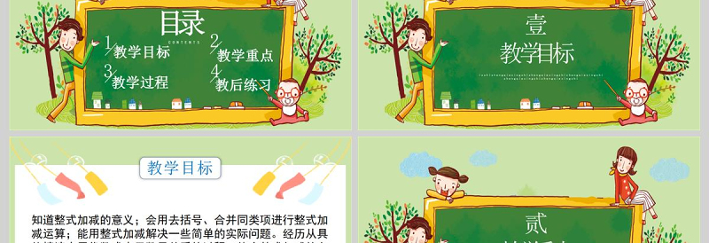 教學(xué)目標(biāo)知道整式加減的意義;會用去括號、合并同類項進(jìn)行整式加減運算;能用整式加減解決一些簡單的實際問題。經(jīng)歷從具體情境中用代數(shù)式表示數(shù)量關(guān)系的過程.體會整式加減的必要性,進(jìn)一步發(fā)展符號感進(jìn)一步發(fā)展符號感;培養(yǎng)學(xué)生認(rèn)真細(xì)致的作風(fēng)和解決問題的能力。