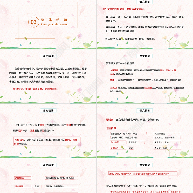 這篇文章反映的不僅僅是革命先烈為了革命事業(yè)而甘于過(guò)清貧、樸素的生活,更體現(xiàn)了以方志敏為代表的共產(chǎn)黨人將清貧做為自己最大財(cái)富的高尚革命氣節(jié)。這種革命氣節(jié),在艱苦的戰(zhàn)爭(zhēng)年代需要它,在今天同樣需要它。課文小結(jié)