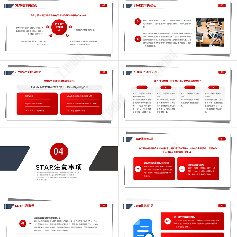 STAR原則-02STAR訪談法在進行BEI的時候,重點是在過去確實的情境中采取的措施和行動方面,不是假設性的答復,哲理性、抽象性或信仰性的行為。它需要采用STAR方法來深層次挖掘出具體的行為細節(jié)來。行為事件法有時也叫STAR訪談法。Situation(情景)Task(任務)Result(結(jié)果)Action(行動)四個英文單詞的首字母組合。STAR原則是結(jié)構(gòu)化面試當中非常重要的一個理論